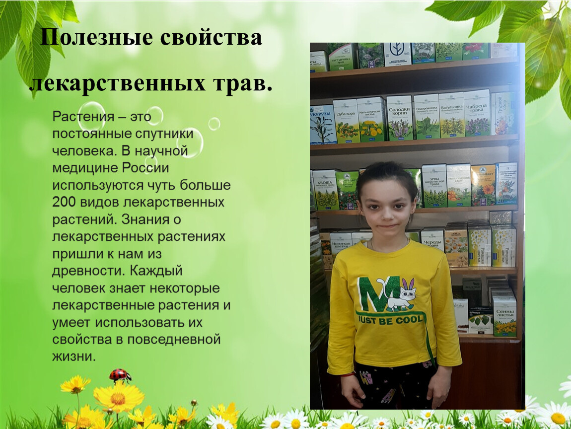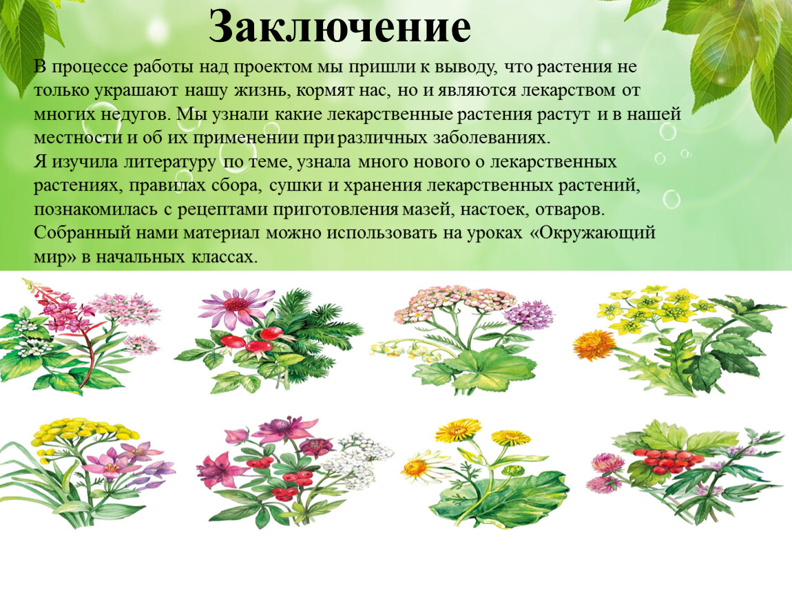 В процессе работы над проектом мы пришли к выводу, что растения не только украшают нашу жизнь, кормят нас, но и являются лекарством от многих недугов. Мы узнали какие лекарственные растения растут и в нашей местности и об их применении при различных заболеваниях.