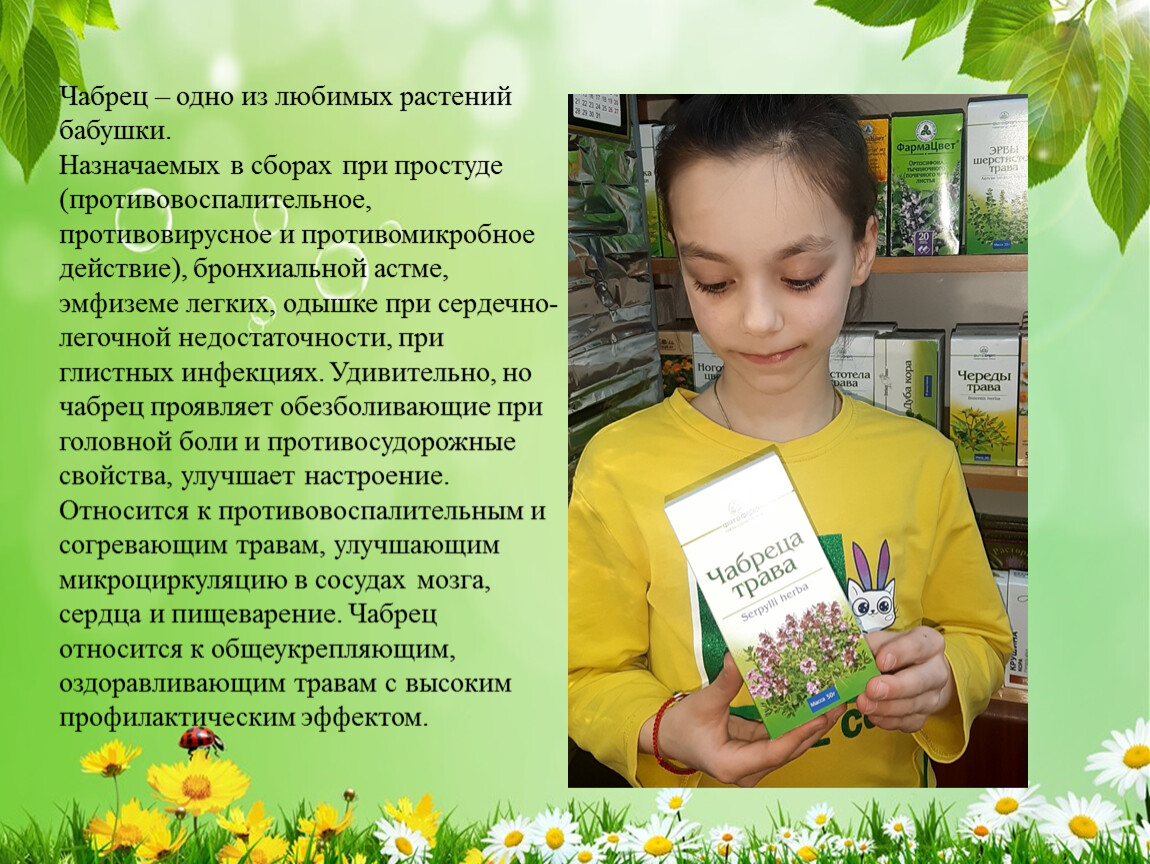 Назначаемых в сборах при простуде (противовоспалительное, противовирусное и противомикробное действие), бронхиальной астме, эмфиземе легких, одышке при сердечно-легочной недостаточности, при глистных инфекциях. Удивительно, но чабрец проявляет обезболивающие при головной боли и противосудорожные свойства, улучшает настроение. Относится к противовоспалительным и согревающим травам, улучшающим микроциркуляцию в сосудах мозга, сердца и пищеварение. Чабрец относится к общеукрепляющим, оздоравливающим травам с высоким профилактическим эффектом.
