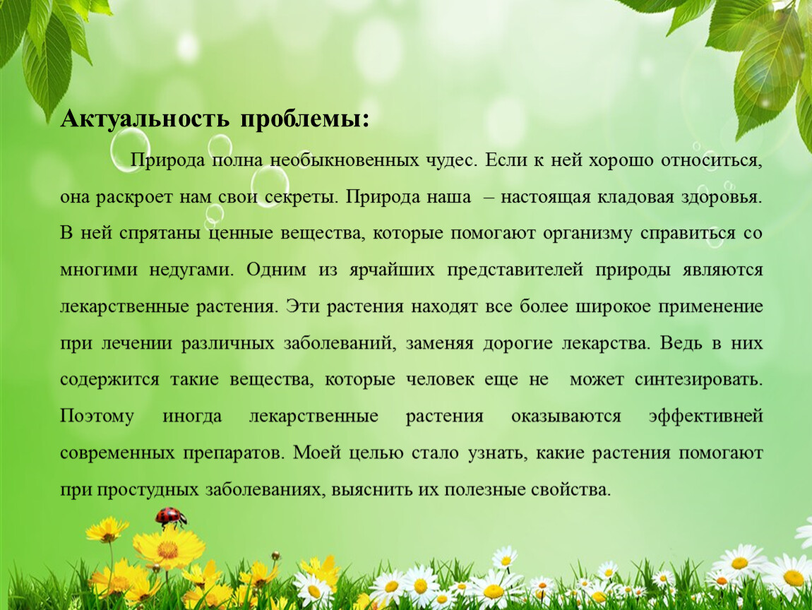 Природа полна необыкновенных чудес. Если к ней хорошо относиться, она раскроет нам свои секреты. Природа наша – настоящая кладовая здоровья. В ней спрятаны ценные вещества, которые помогают организму справиться со многими недугами. Одним из ярчайших представителей природы являются лекарственные растения. Эти растения находят все более широкое применение при лечении различных заболеваний, заменяя дорогие лекарства. Ведь в них содержится такие вещества, которые человек еще не может синтезировать. Поэтому иногда лекарственные растения оказываются эффективней современных препаратов. Моей целью стало узнать, какие растения помогают при простудных заболеваниях, выяснить их полезные свойства.