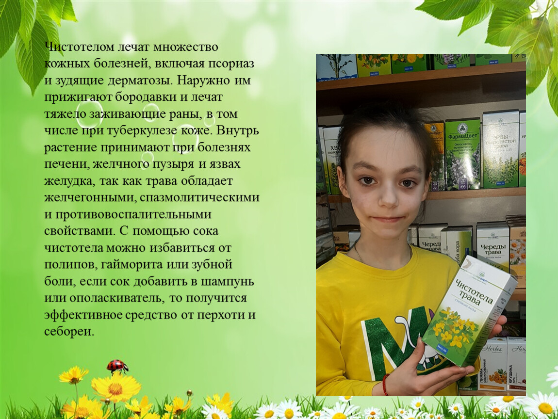 Чистотелом лечат множество кожных болезней, включая псориаз и зудящие дерматозы. Наружно им прижигают бородавки и лечат тяжело заживающие раны, в том числе при туберкулезе коже. Внутрь растение принимают при болезнях печени, желчного пузыря и язвах желудка, так как трава обладает желчегонными, спазмолитическими и противовоспалительными свойствами. С помощью сока чистотела можно избавиться от полипов, гайморита или зубной боли, если сок добавить в шампунь или ополаскиватель, то получится эффективное средство от перхоти и себореи.