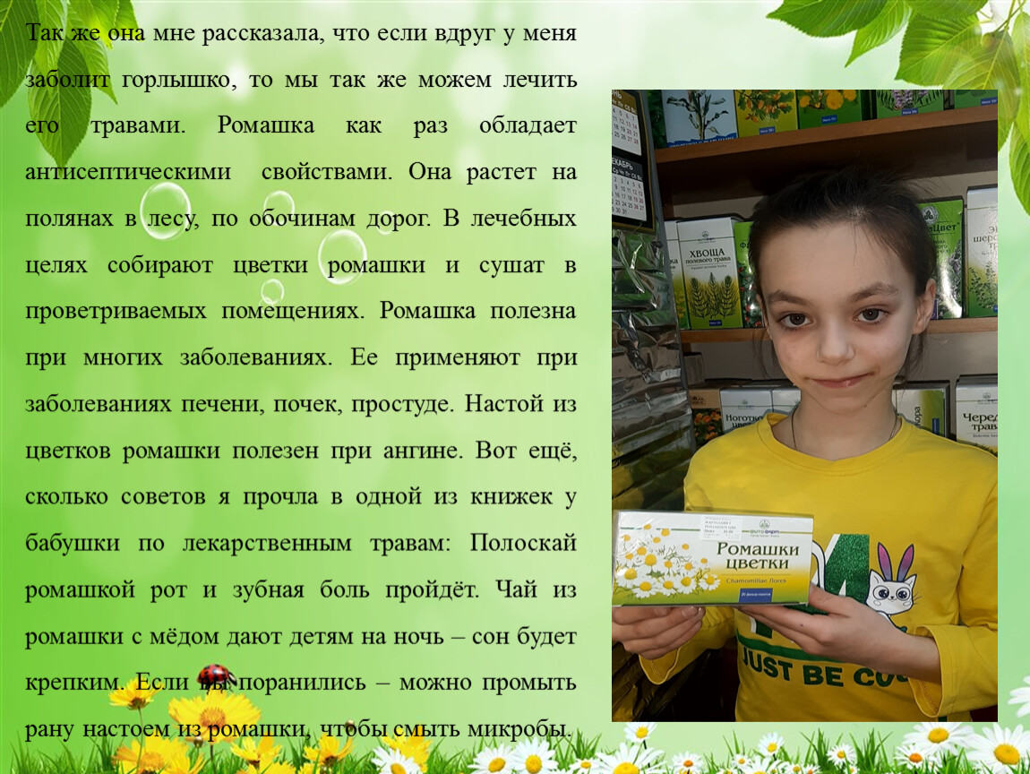 Так же она мне рассказала, что если вдруг у меня заболит горлышко, то мы так же можем лечить его травами. Ромашка как раз обладает антисептическими свойствами. Она растет на полянах в лесу, по обочинам дорог. В лечебных целях собирают цветки ромашки и сушат в проветриваемых помещениях. Ромашка полезна при многих заболеваниях. Ее применяют при заболеваниях печени, почек, простуде. Настой из цветков ромашки полезен при ангине. Вот ещё, сколько советов я прочла в одной из книжек у бабушки по лекарственным травам: Полоскай ромашкой рот и зубная боль пройдёт. Чай из ромашки с мёдом дают детям на ночь – сон будет крепким. Если вы поранились – можно промыть рану настоем из ромашки, чтобы смыть микробы.