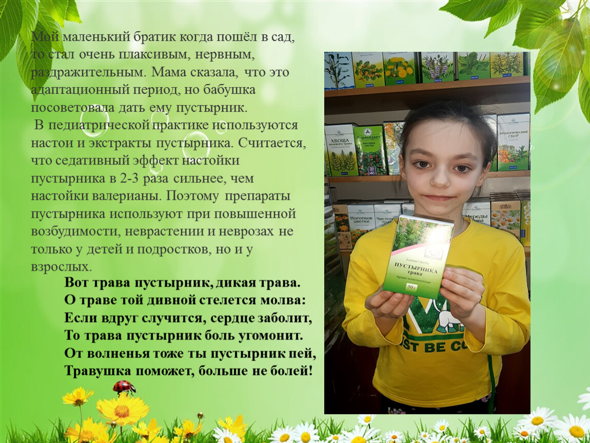 В педиатрической практике используются настои и экстракты пустырника. Считается, что седативный эффект настойки пустырника в 2-3 раза сильнее, чем настойки валерианы. Поэтому препараты пустырника используют при повышенной возбудимости, неврастении и неврозах не только у детей и подростков, но и у взрослых.