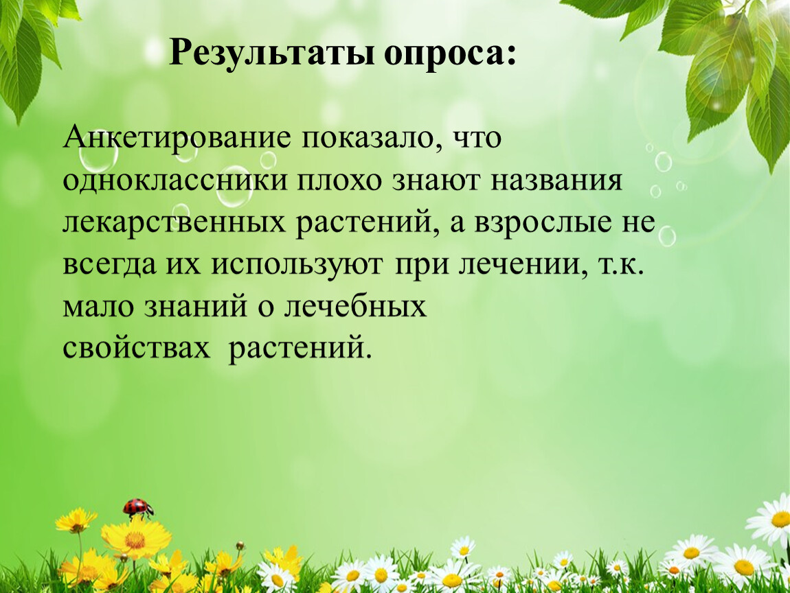 Нами был проведен опрос 30 учеников и 10 учителей нашей школы, и выяснено, какие лекарственные растения они знают, какую пользу приносят и как сохранить эти растения.
