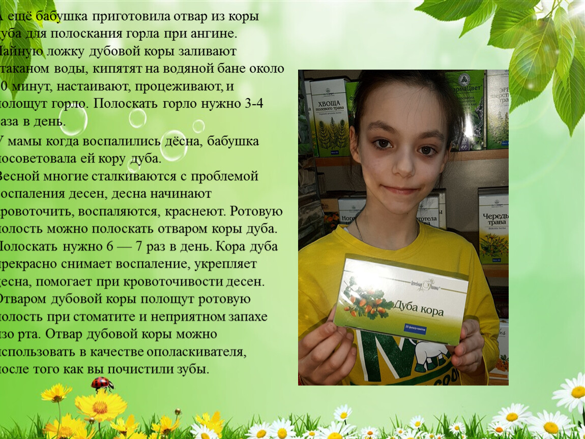 А ещё бабушка приготовила отвар из коры дуба для полоскания горла при ангине. Чайную ложку дубовой коры заливают стаканом воды, кипятят на водяной бане около 10 минут, настаивают, процеживают, и полощут горло. Полоскать горло нужно 3-4 раза в день.