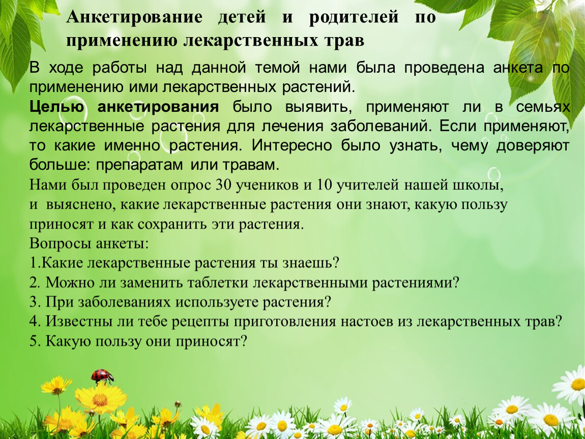 Целью анкетирования было выявить, применяют ли в семьях лекарственные растения для лечения заболеваний. Если применяют, то какие именно растения. Интересно было узнать, чему доверяют больше: препаратам или травам.