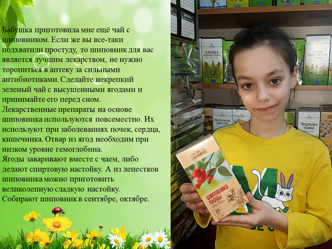Хочу с вами поделиться своей историей. К нам летом приехала бабушка погостить. К концу каникул я простыла. А моя бабушка большой знаток природы. Она давно интересуется полезными свойствами лекарственных растений и ягод. Чаи и отвары из бабушкиной аптеки помогают нам преодолеть простуду, восстановить силы или просто взбодриться.