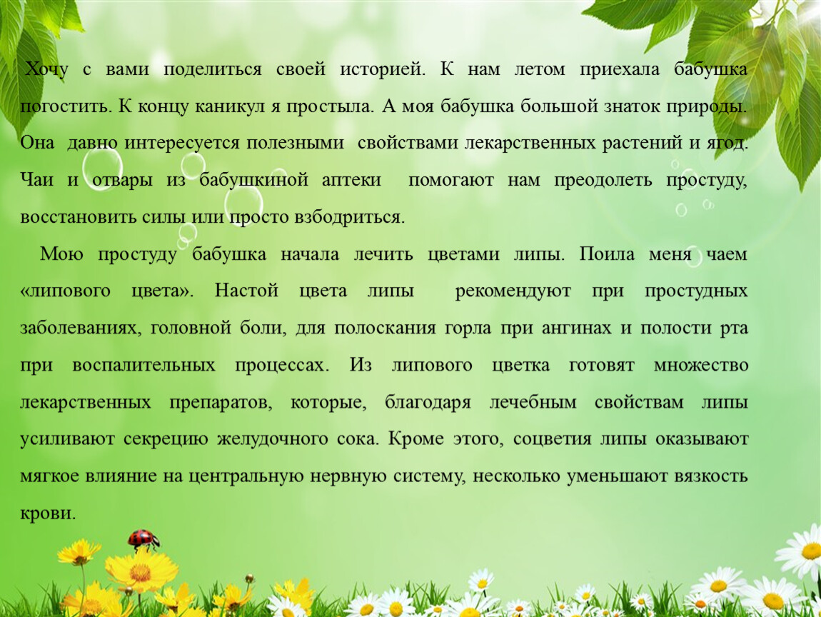 Мою простуду бабушка начала лечить цветами липы. Поила меня чаем «липового цвета». Настой цвета липы рекомендуют при простудных заболеваниях, головной боли, для полоскания горла при ангинах и полости рта при воспалительных процессах. Из липового цветка готовят множество лекарственных препаратов, которые, благодаря лечебным свойствам липы усиливают секрецию желудочного сока. Кроме этого, соцветия липы оказывают мягкое влияние на центральную нервную систему, несколько уменьшают вязкость крови.