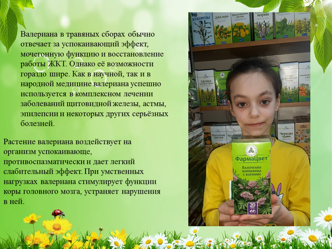 Растение валериана воздействует на организм успокаивающе, противоспазматически и дает легкий слабительный эффект. При умственных нагрузках валериана стимулирует функции коры головного мозга, устраняет нарушения в ней.