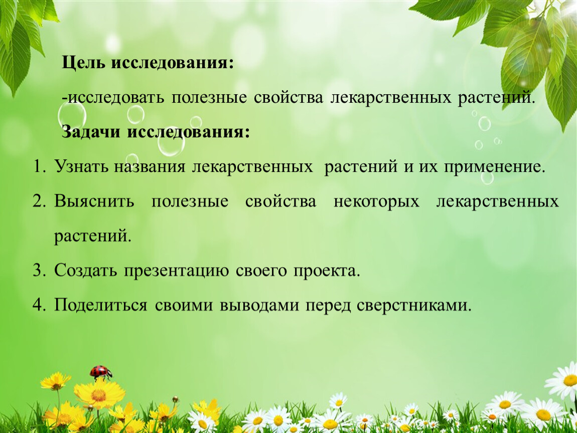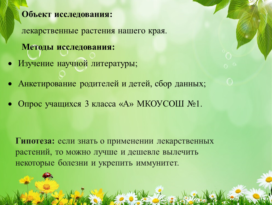 Гипотеза: если знать о применении лекарственных растений, то можно лучше и дешевле вылечить некоторые болезни и укрепить иммунитет.