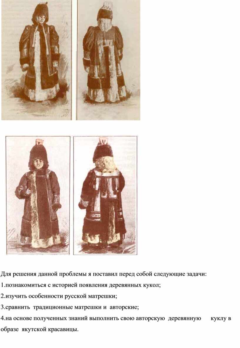 4.на основе полученных знаний выполнить свою авторскую деревянную куклу в образе якутской красавицы.