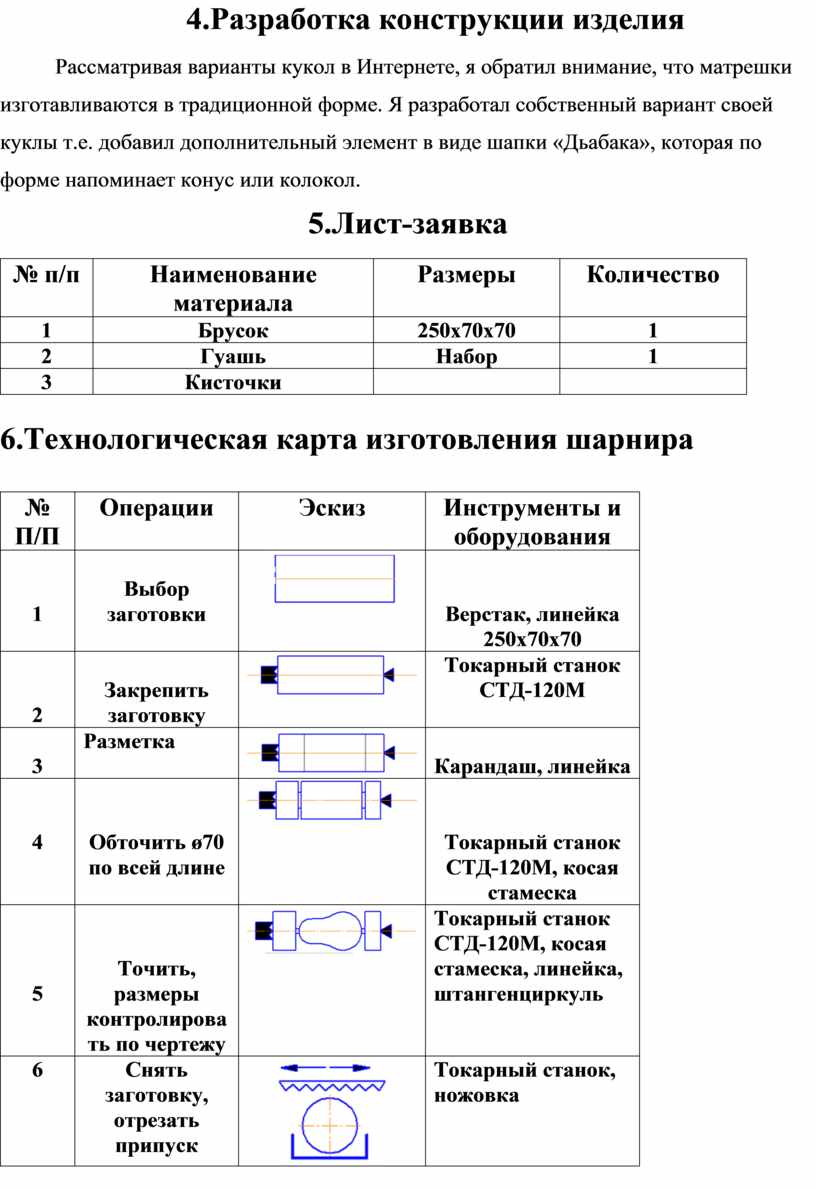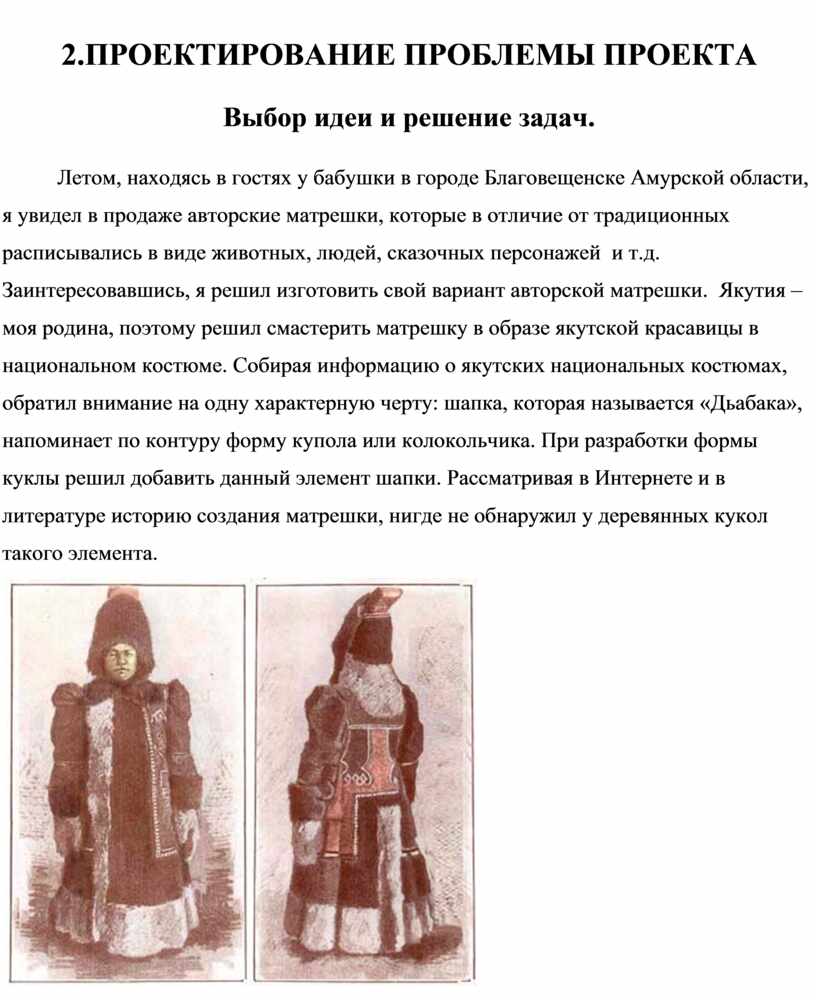 Заинтересовавшись, я решил изготовить свой вариант авторской матрешки. Якутия – моя родина, поэтому решил смастерить матрешку в образе якутской красавицы в национальном костюме. Собирая информацию о якутских национальных костюмах, обратил внимание на одну характерную черту: шапка, которая называется «Дьабака», напоминает по контуру форму купола или колокольчика. При разработки формы куклы решил добавить данный элемент шапки. Рассматривая в Интернете и в литературе историю создания матрешки, нигде не обнаружил у деревянных кукол такого элемента.