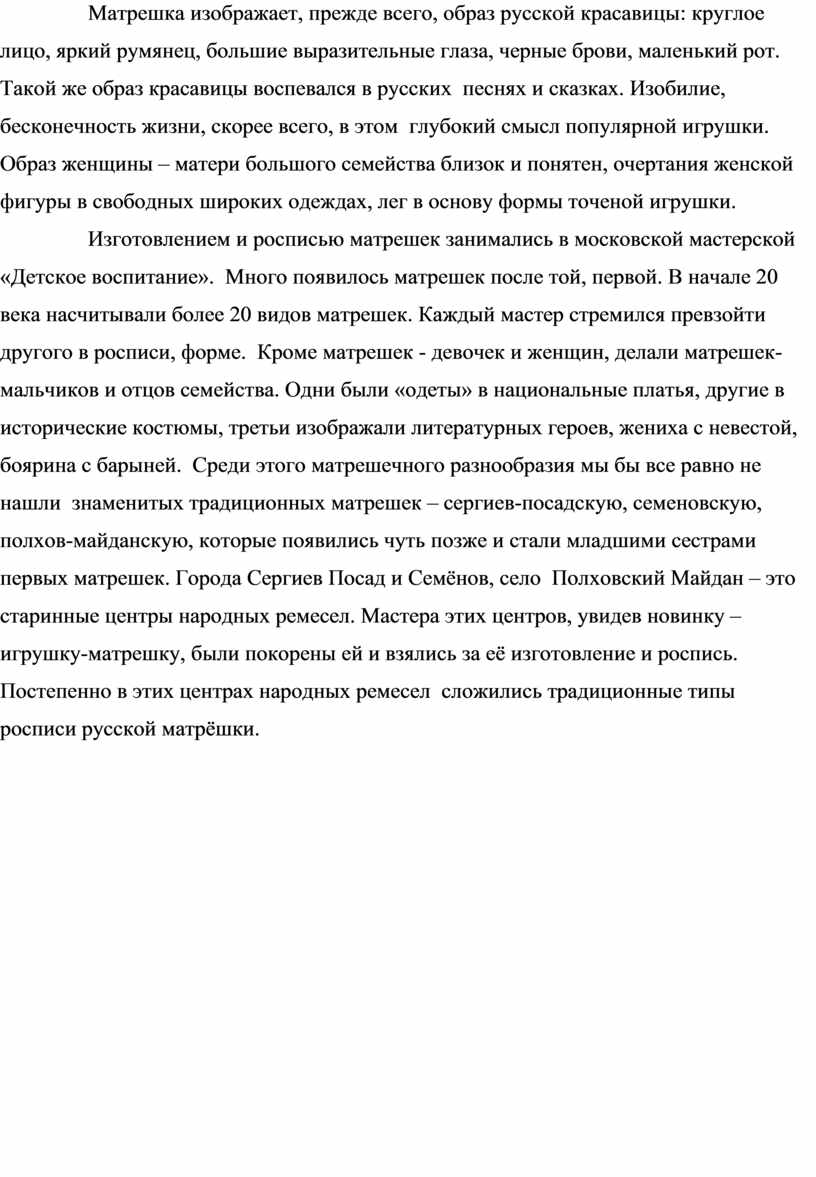 Матрешка изображает, прежде всего, образ русской красавицы: круглое лицо, яркий румянец, большие выразительные глаза, черные брови, маленький рот. Такой же образ красавицы воспевался в русских песнях и сказках. Изобилие, бесконечность жизни, скорее всего, в этом глубокий смысл популярной игрушки. Образ женщины – матери большого семейства близок и понятен, очертания женской фигуры в свободных широких одеждах, лег в основу формы точеной игрушки.