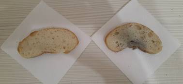 В практической части исследовательской деятельности я решил провести опыт с хлебом и чесноком. Принёс в школу два кусочка белого хлеба и провёл опыт, подтверждающий отличное свойство чеснока, которое сдерживает рост микроорганизмов.