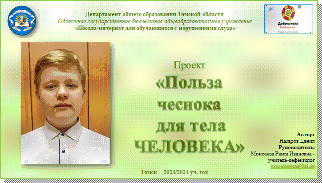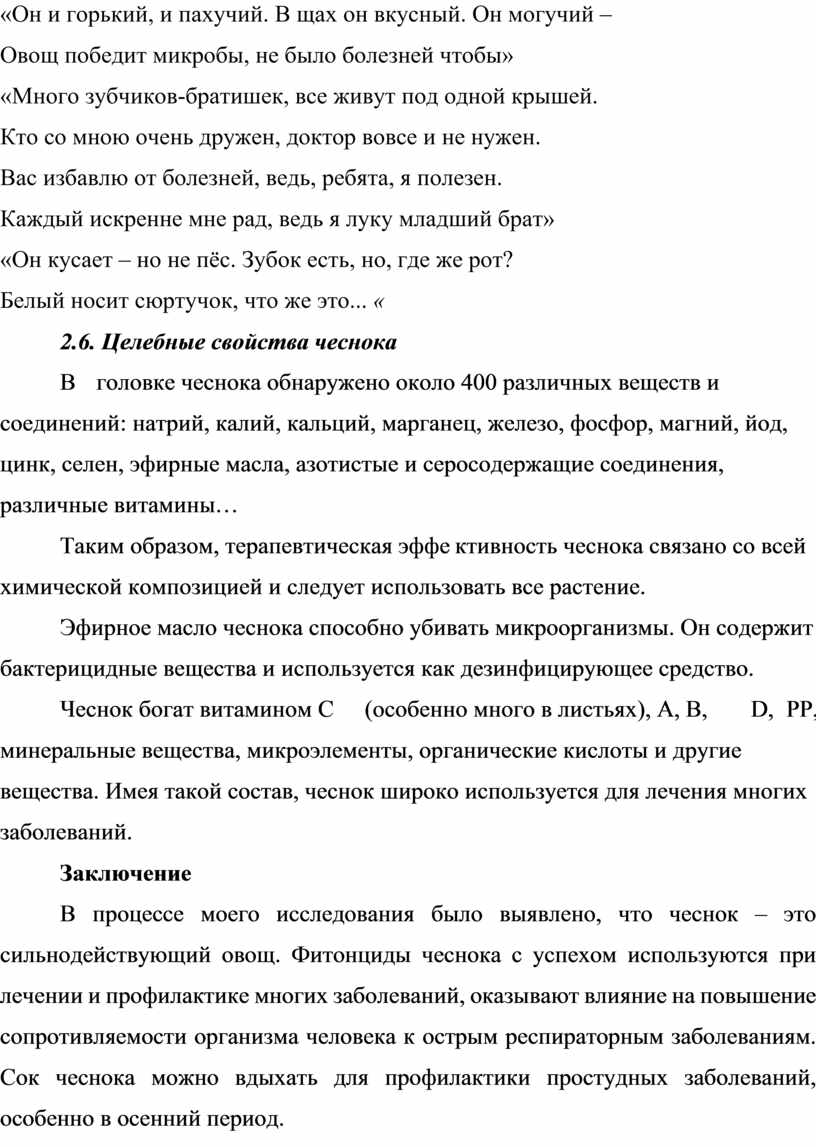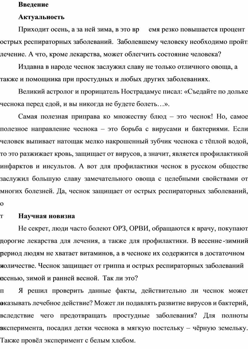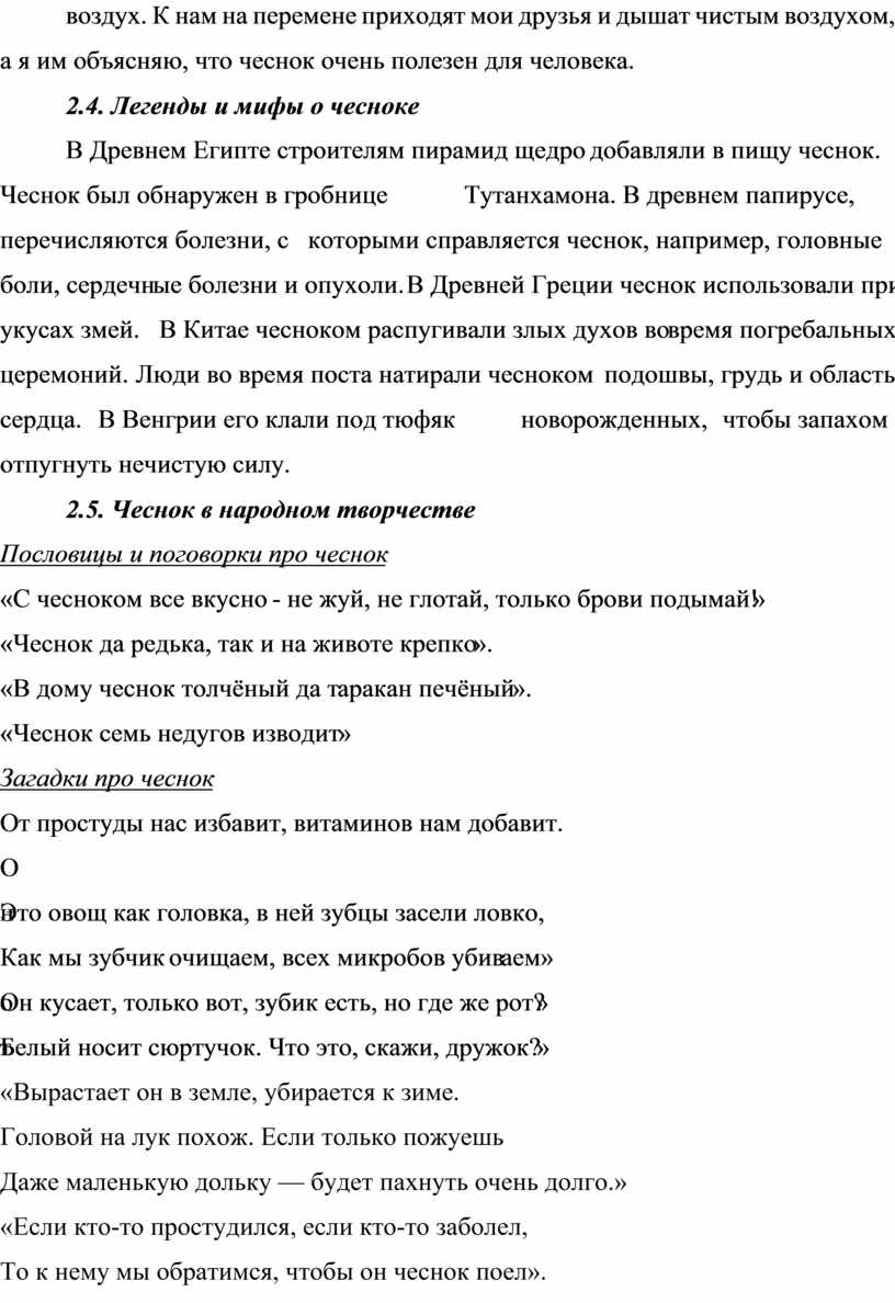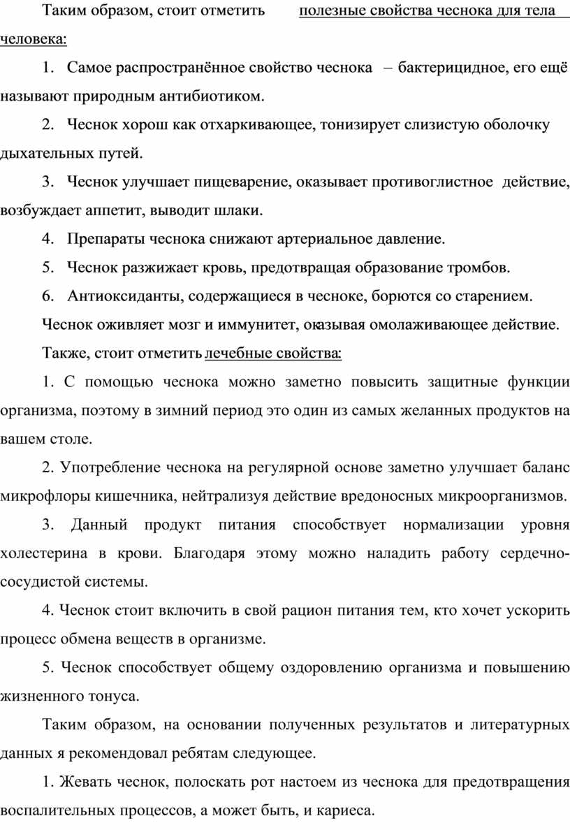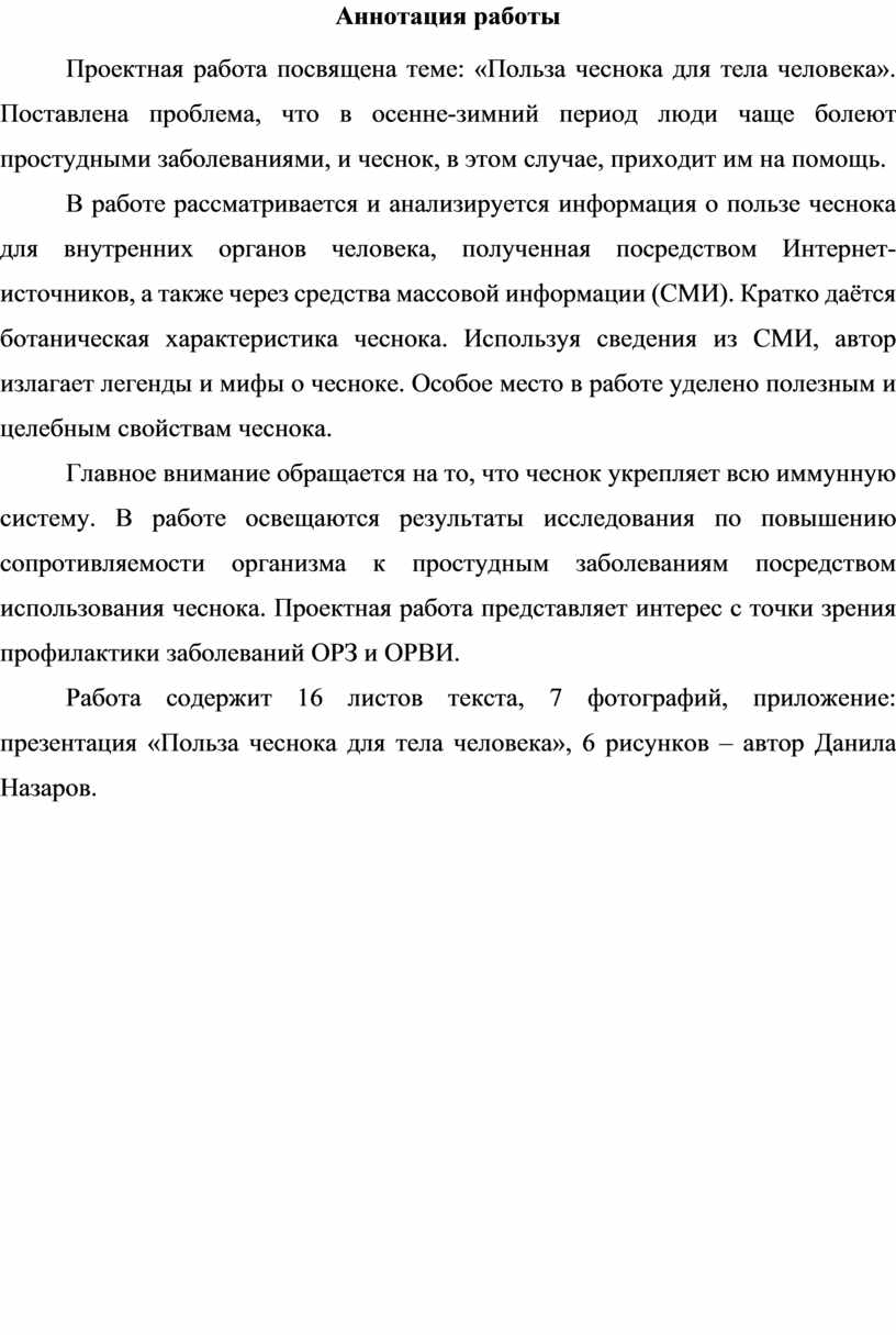 Работа содержит 16 листов текста, 7 фотографий, приложение: презентация «Польза чеснока для тела человека», 6 рисунков – автор Данила Назаров.