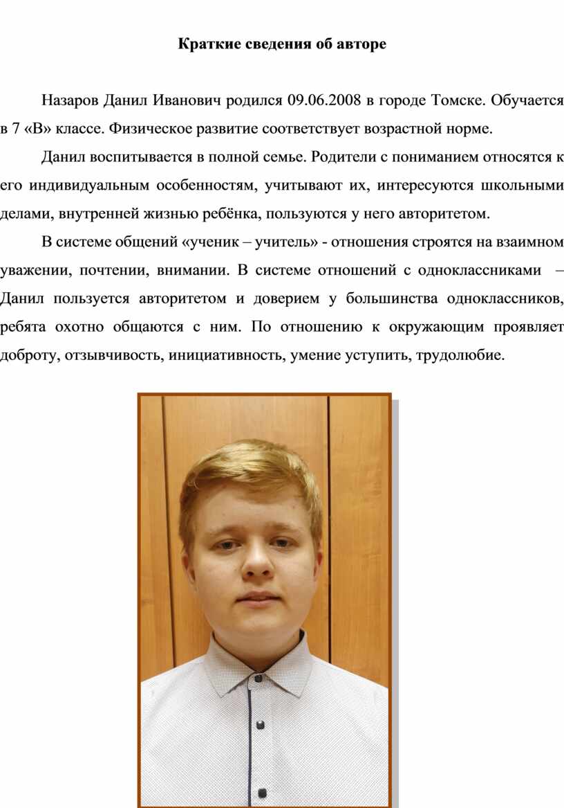 Назаров Данил Иванович родился 09.06.2008 в городе Томске. Обучается в 7 «В» классе. Физическое развитие соответствует возрастной норме.