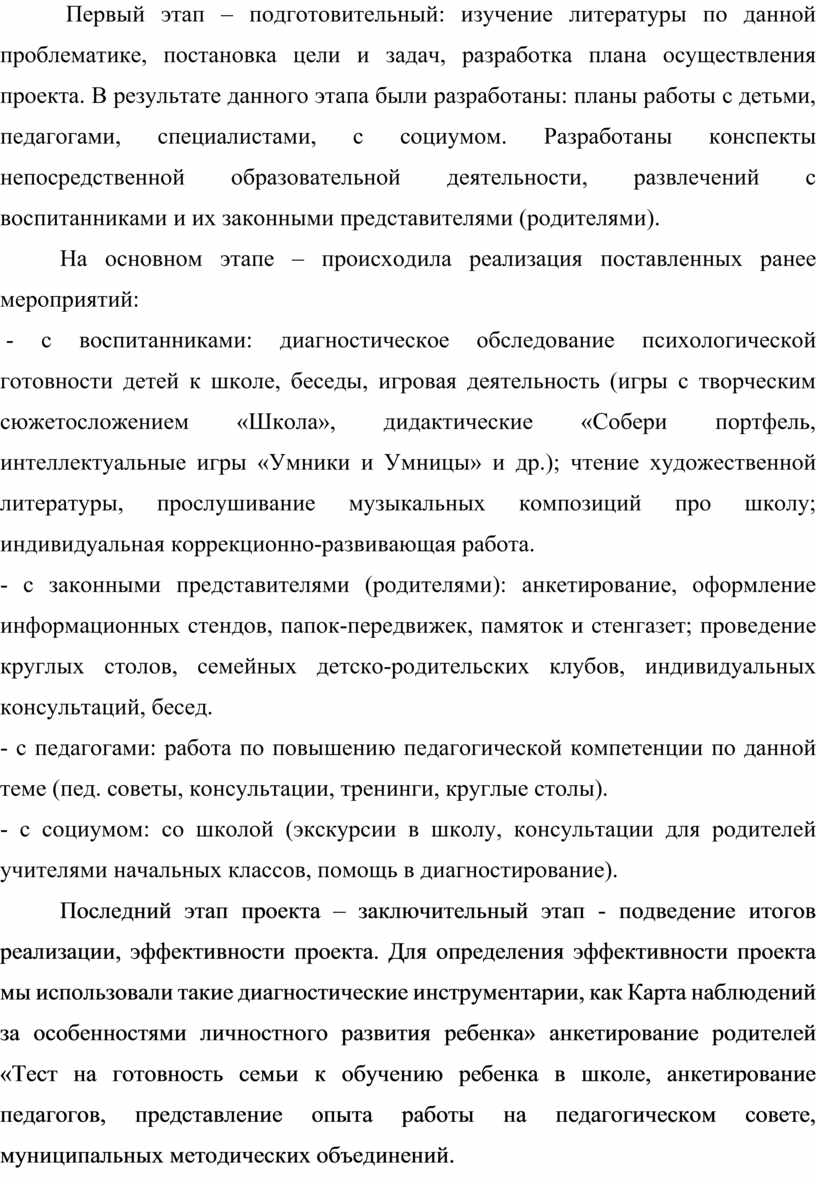 Последний этап проекта – заключительный этап - подведение итогов реализации, эффективности проекта. Для определения эффективности проекта мы использовали такие диагностические инструментарии, как Карта наблюдений за особенностями личностного развития ребенка» анкетирование родителей «Тест на готовность семьи к обучению ребенка в школе, анкетирование педагогов, представление опыта работы на педагогическом совете, муниципальных методических объединений.