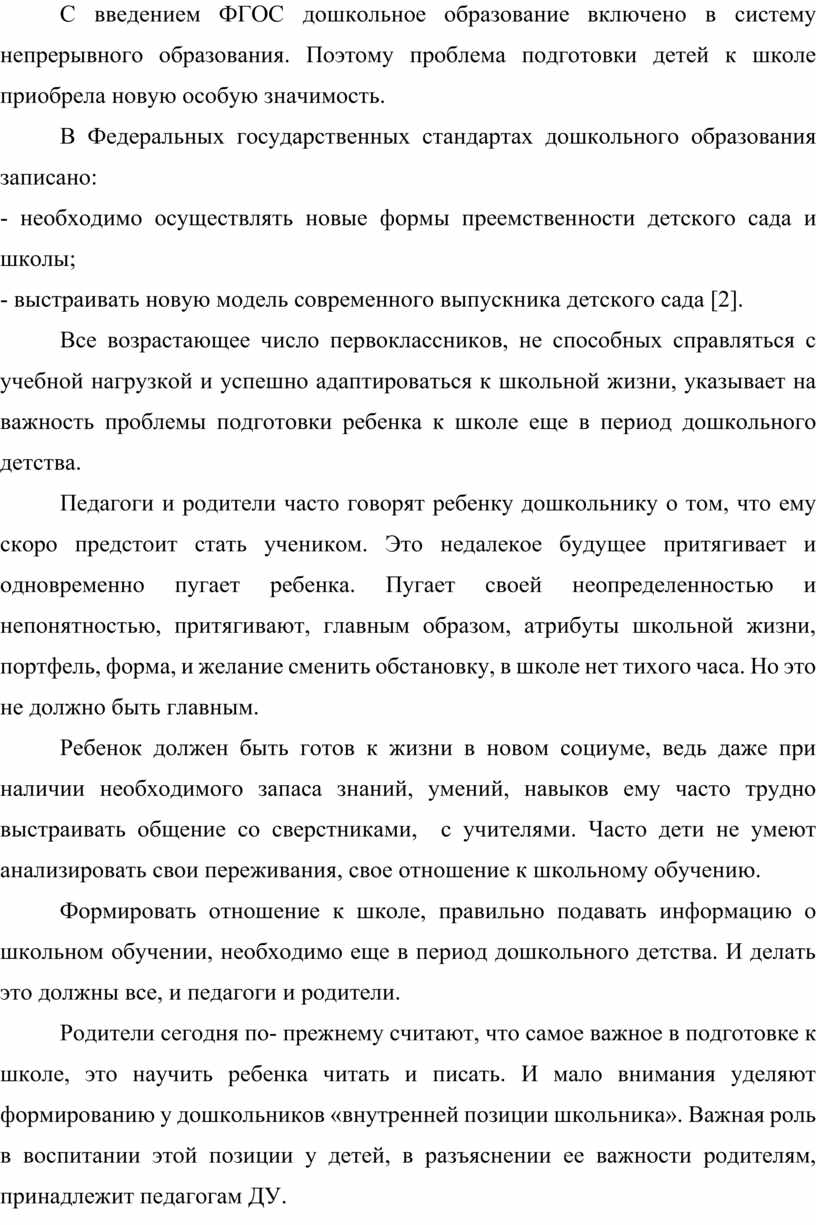С введением ФГОС дошкольное образование включено в систему непрерывного образования. Поэтому проблема подготовки детей к школе приобрела новую особую значимость.