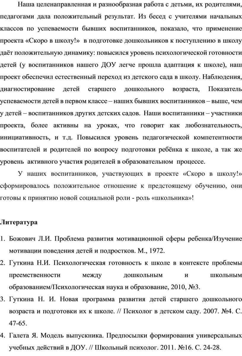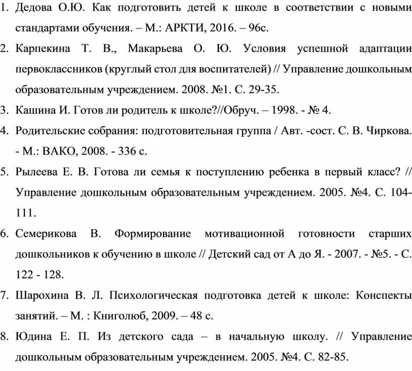2. Гуткина Н.И. Психологическая готовность к школе в контексте проблемы преемственности между дошкольным и школьным образованием/Психологическая наука и образование, 2010, №3.