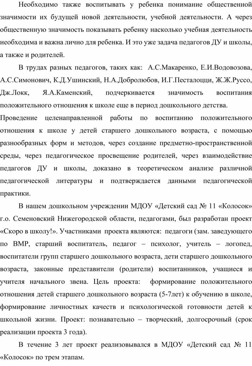 В нашем дошкольном учреждении МДОУ «Детский сад № 11 «Колосок» г.о. Семеновский Нижегородской области, педагогами, был разработан проект «Скоро в школу!». Участниками проекта являются: педагоги (зам. заведующего по ВМР, старший воспитатель, педагог – психолог, учитель – логопед, воспитатели групп старшего дошкольного возраста, дети старшего дошкольного возраста, законные представители (родители) воспитанников, учащиеся и учителя начального звена. Цель проекта: формирование положительного отношения детей старшего дошкольного возраста (5-7лет) к обучению в школе, формирование личностных качеств и психологической готовности детей к школьной жизни. Проект: познавательно – творческий, долгосрочный (срок реализации проекта 3 года).