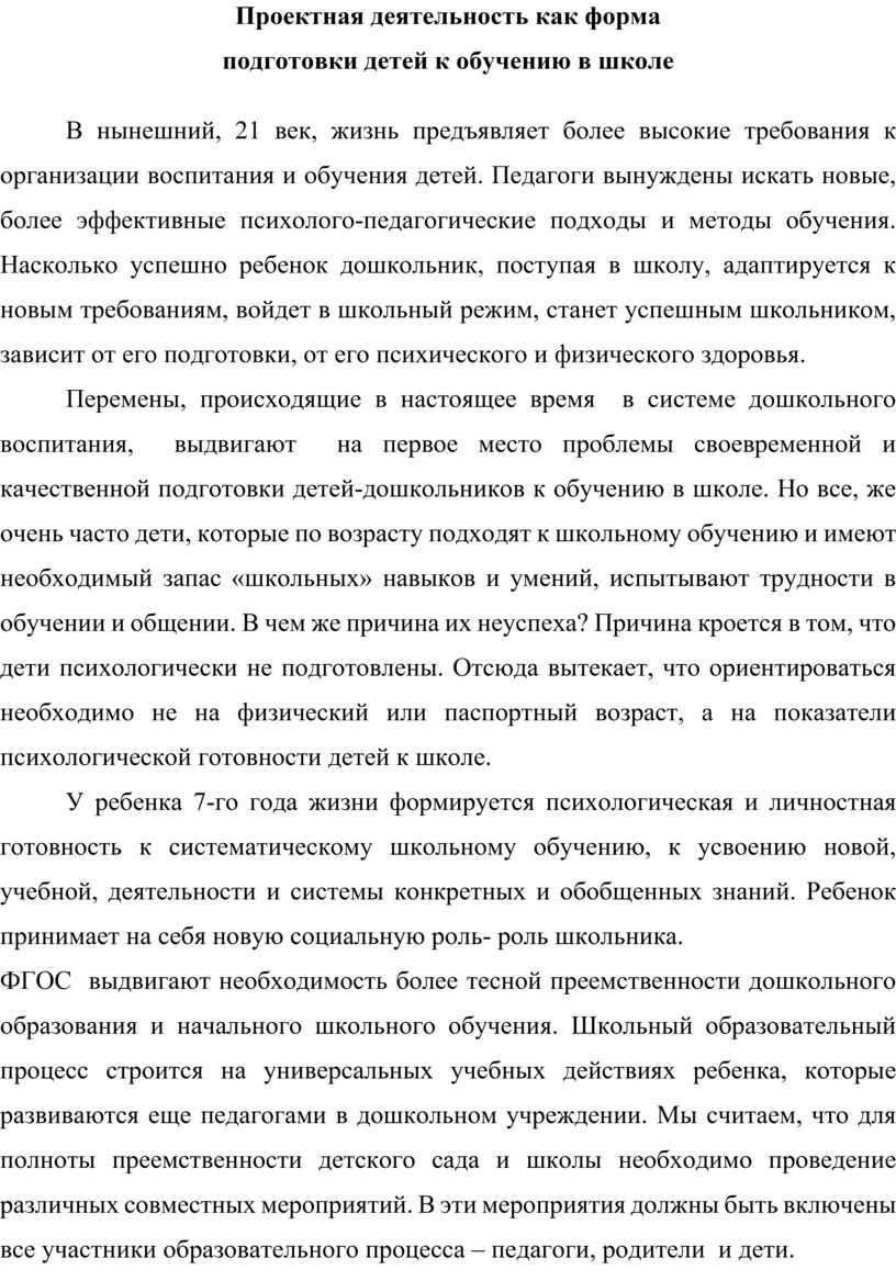 Перемены, происходящие в настоящее время в системе дошкольного воспитания, выдвигают на первое место проблемы своевременной и качественной подготовки детей-дошкольников к обучению в школе. Но все, же очень часто дети, которые по возрасту подходят к школьному обучению и имеют необходимый запас «школьных» навыков и умений, испытывают трудности в обучении и общении. В чем же причина их неуспеха? Причина кроется в том, что дети психологически не подготовлены. Отсюда вытекает, что ориентироваться необходимо не на физический или паспортный возраст, а на показатели психологической готовности детей к школе.