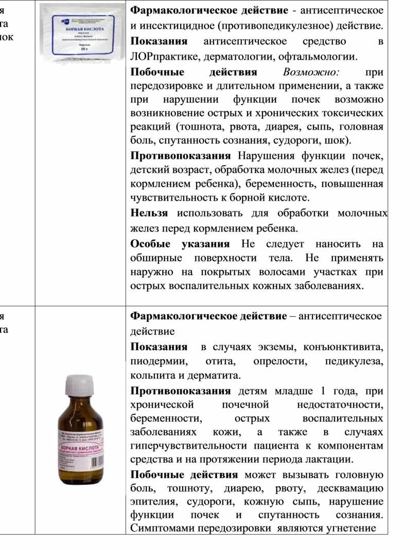 Фармакологическое действие - антисептическое и инсектицидное (противопедикулезное) действие. Показания антисептическое средство в ЛОРпрактике, дерматологии, офтальмологии. Побочные действия Возможно: при передозировке и длительном применении, а также при нарушении функции почек возможно возникновение острых и хронических токсических реакций (тошнота, рвота, диарея, сыпь, головная боль, спутанность сознания, судороги, шок). Противопоказания Нарушения функции почек, детский возраст, обработка молочных желез (перед кормлением ребенка), беременность, повышенная чувствительность к борной кислоте. Нельзя использовать для обработки молочных желез перед кормлением ребенка. Особые указания Не следует наносить на обширные поверхности тела. Не применять наружно на покрытых волосами участках при острых воспалительных кожных заболеваниях.