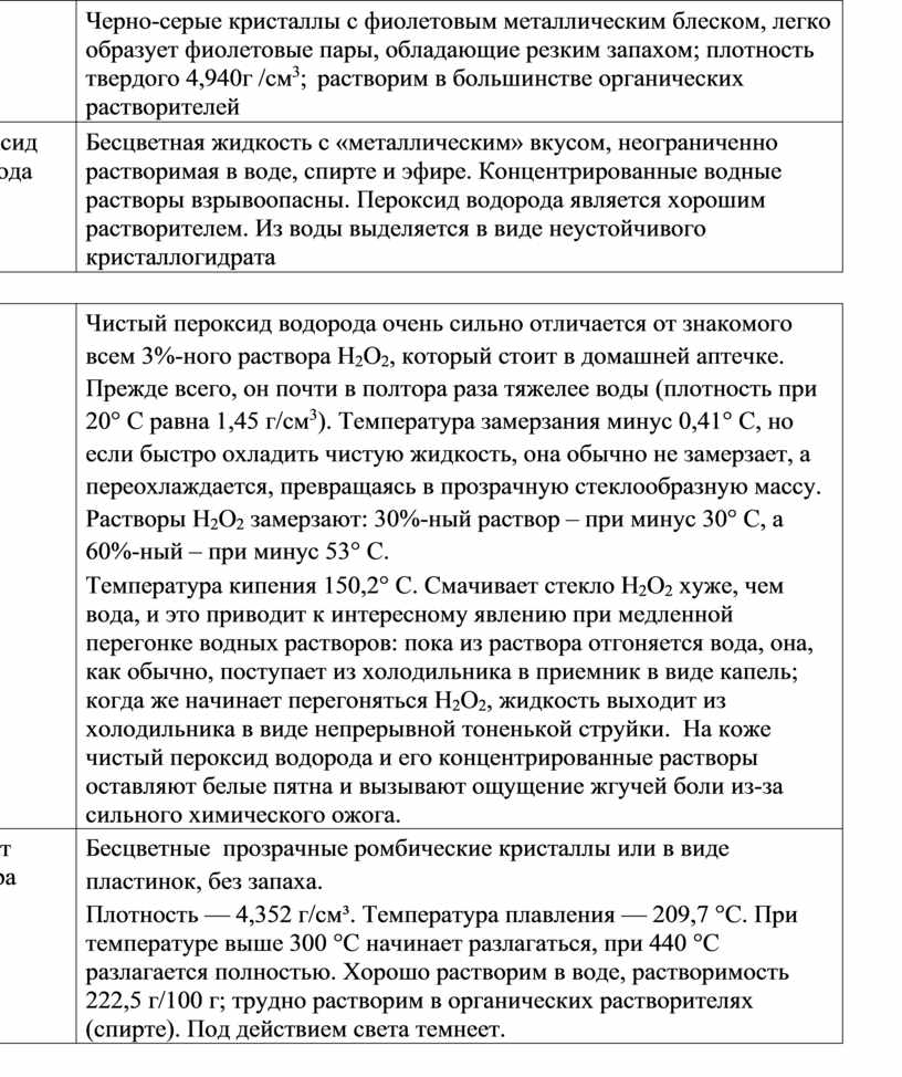 Чистый пероксид водорода очень сильно отличается от знакомого всем 3%-ного раствора Н2О2, который стоит в домашней аптечке. Прежде всего, он почти в полтора раза тяжелее воды (плотность при 20° С равна 1,45 г/см3). Температура замерзания минус 0,41° С, но если быстро охладить чистую жидкость, она обычно не замерзает, а переохлаждается, превращаясь в прозрачную стеклообразную массу. Растворы Н2О2 замерзают: 30%-ный раствор – при минус 30° С, а 60%-ный – при минус 53° С. Температура кипения 150,2° С. Смачивает стекло Н2О2 хуже, чем вода, и это приводит к интересному явлению при медленной перегонке водных растворов: пока из раствора отгоняется вода, она, как обычно, поступает из холодильника в приемник в виде капель; когда же начинает перегоняться Н2О2, жидкость выходит из холодильника в виде непрерывной тоненькой струйки. На коже чистый пероксид водорода и его концентрированные растворы оставляют белые пятна и вызывают ощущение жгучей боли из-за сильного химического ожога. |