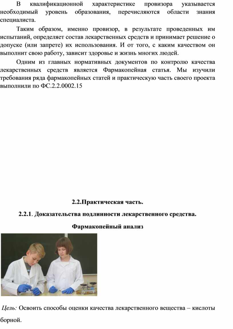 Одним из главных нормативных документов по контролю качества лекарственных средств является Фармакопейная статья. Мы изучили требования ряда фармакопейных статей и практическую часть своего проекта выполнили по ФС.2.2.0002.15