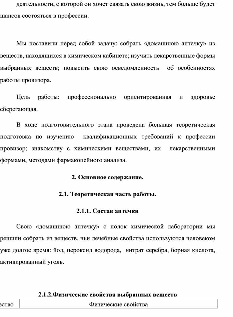 Мы поставили перед собой задачу: собрать «домашнюю аптечку» из веществ, находящихся в химическом кабинете; изучить лекарственные формы выбранных веществ; повысить свою осведомленность об особенностях работы провизора.