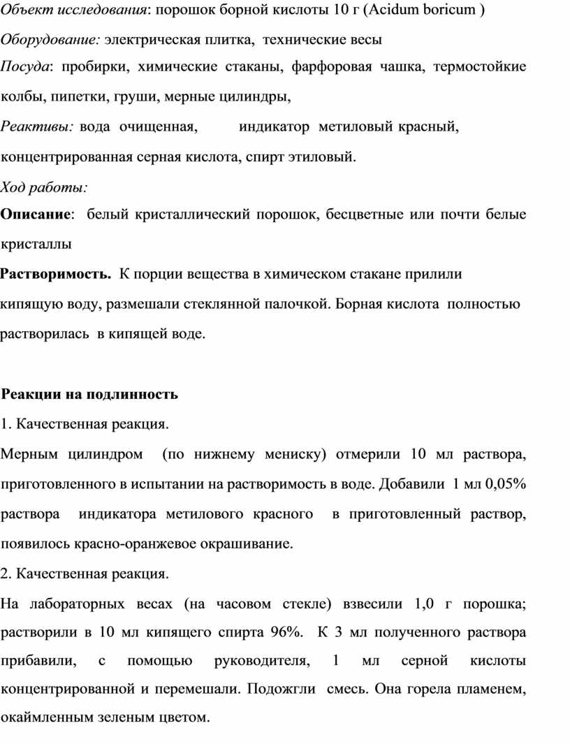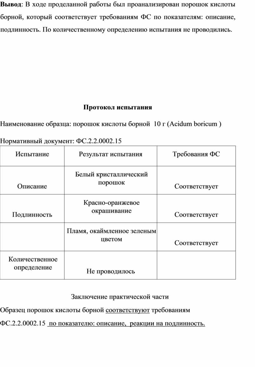 Вывод: В ходе проделанной работы был проанализирован порошок кислоты борной, который соответствует требованиям ФС по показателям: описание, подлинность. По количественному определению испытания не проводились.