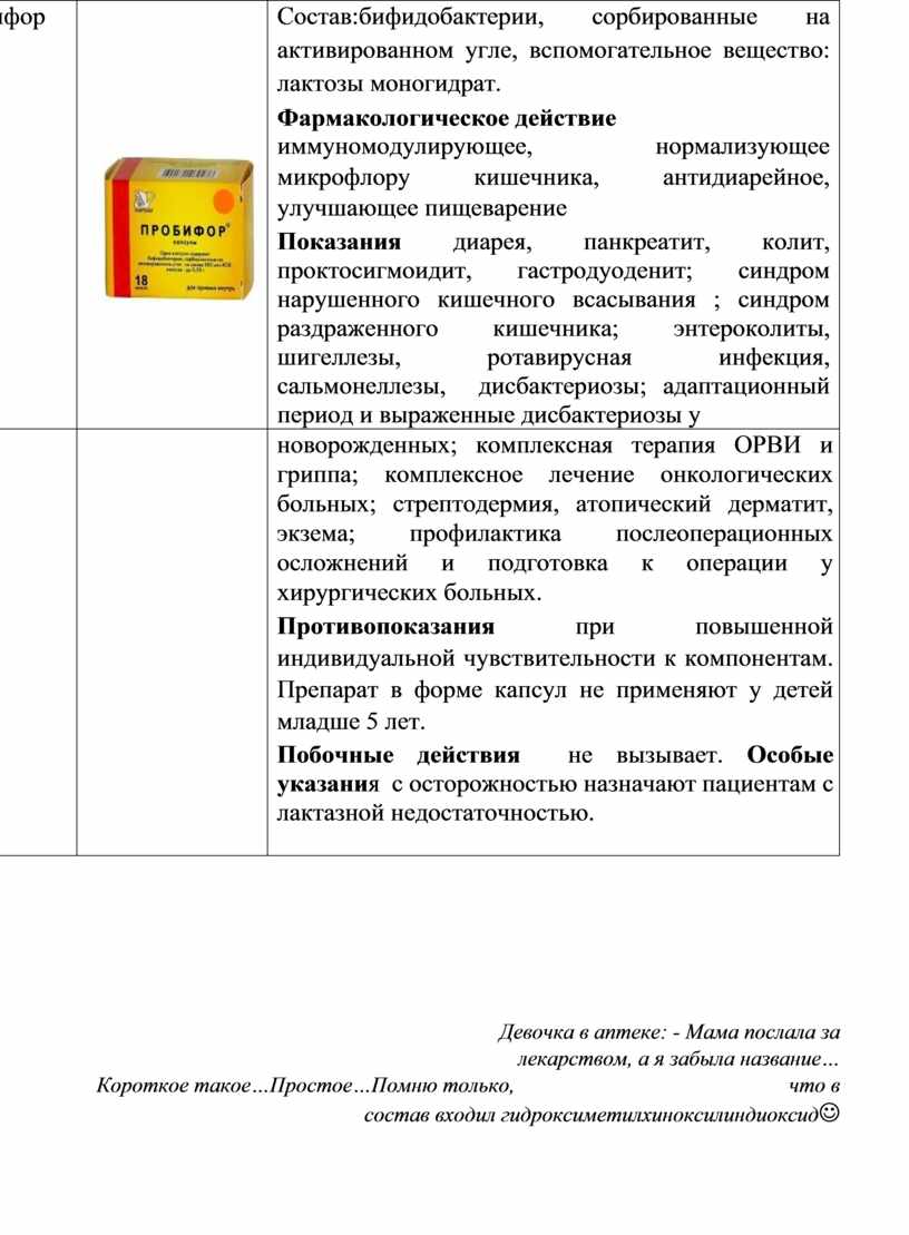 Состав:бифидобактерии, сорбированные на активированном угле, вспомогательное вещество: лактозы моногидрат. Фармакологическое действие иммуномодулирующее, нормализующее микрофлору кишечника, антидиарейное, улучшающее пищеварение Показания диарея, панкреатит, колит, проктосигмоидит, гастродуоденит; синдром нарушенного кишечного всасывания ; синдром раздраженного кишечника; энтероколиты, шигеллезы, ротавирусная инфекция, сальмонеллезы, дисбактериозы; адаптационный период и выраженные дисбактериозы у |