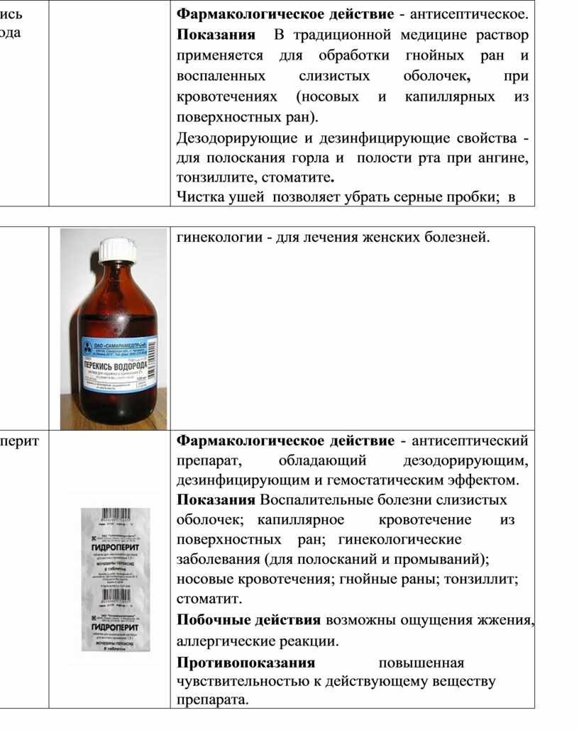 Фармакологическое действие - антисептическое. Показания В традиционной медицине раствор применяется для обработки гнойных ран и воспаленных слизистых оболочек, при кровотечениях (носовых и капиллярных из поверхностных ран). Дезодорирующие и дезинфицирующие свойства - для полоскания горла и полости рта при ангине, тонзиллите, стоматите. Чистка ушей позволяет убрать серные пробки; в |