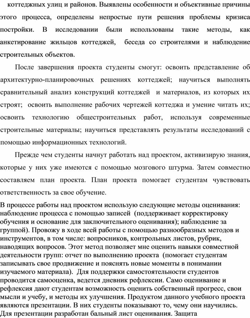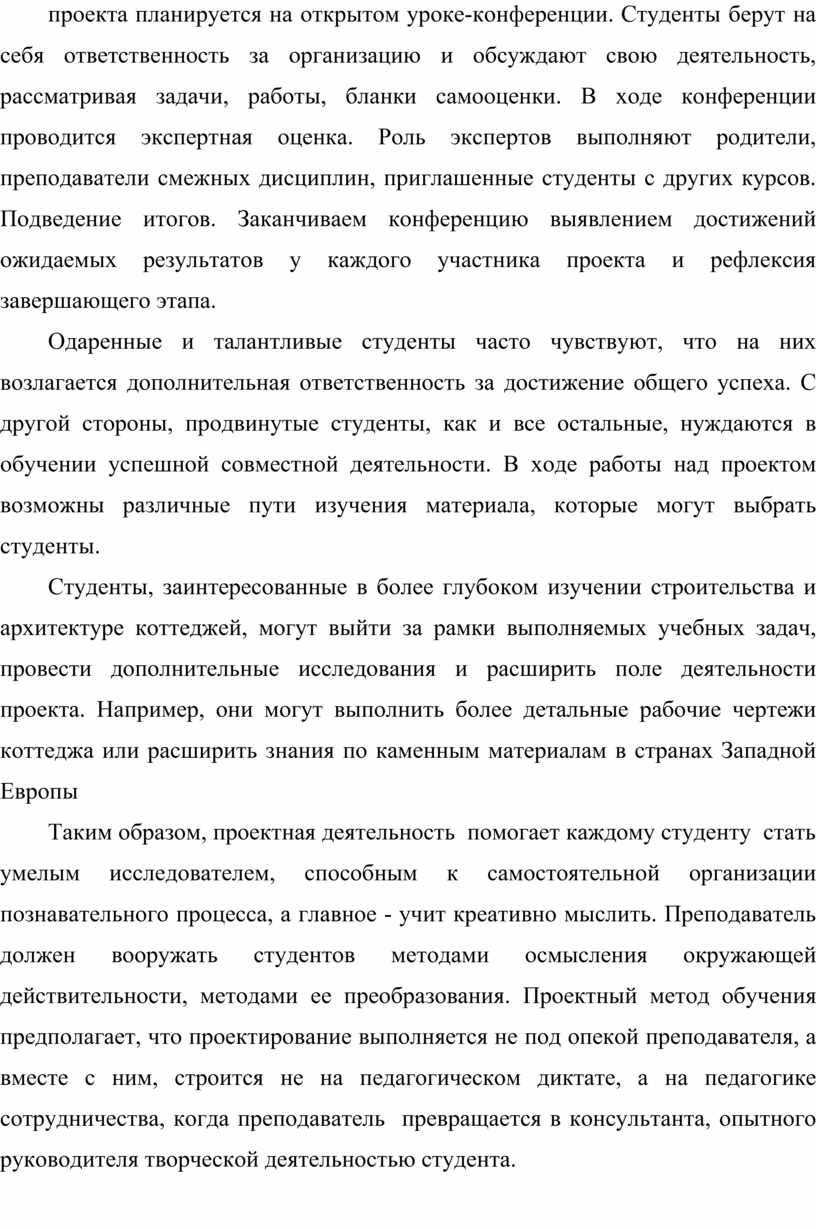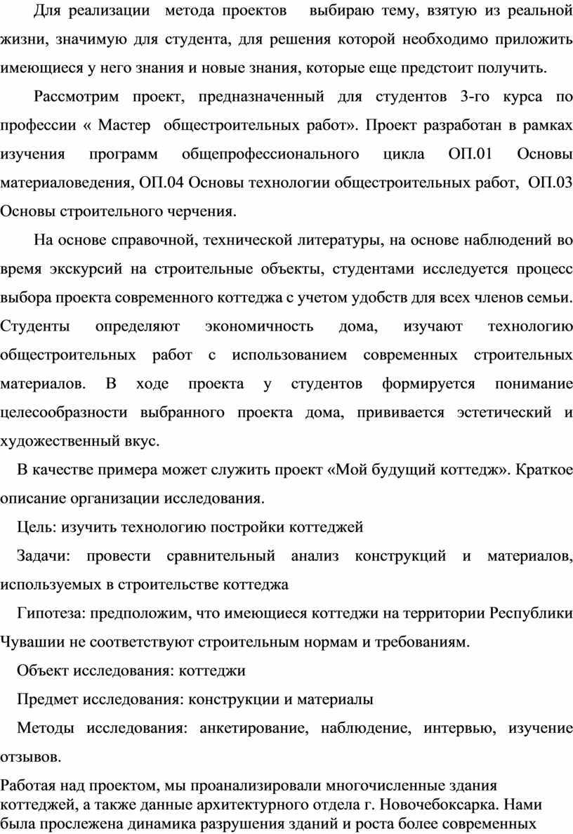 На основе справочной, технической литературы, на основе наблюдений во время экскурсий на строительные объекты, студентами исследуется процесс выбора проекта современного коттеджа с учетом удобств для всех членов семьи. Студенты определяют экономичность дома, изучают технологию общестроительных работ с использованием современных строительных материалов. В ходе проекта у студентов формируется понимание целесообразности выбранного проекта дома, прививается эстетический и художественный вкус.