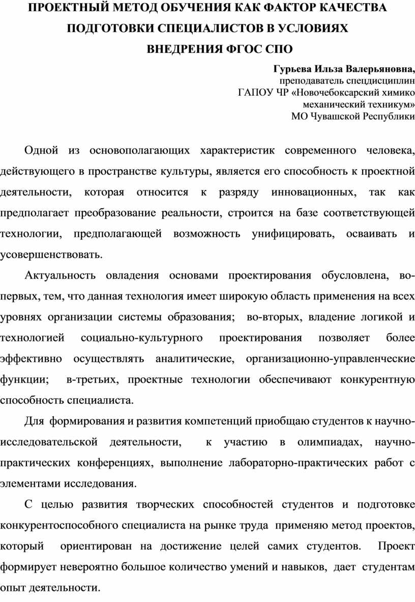 ПРОЕКТНЫЙ МЕТОД ОБУЧЕНИЯ КАК ФАКТОР КАЧЕСТВА ПОДГОТОВКИ СПЕЦИАЛИСТОВ В УСЛОВИЯХ
