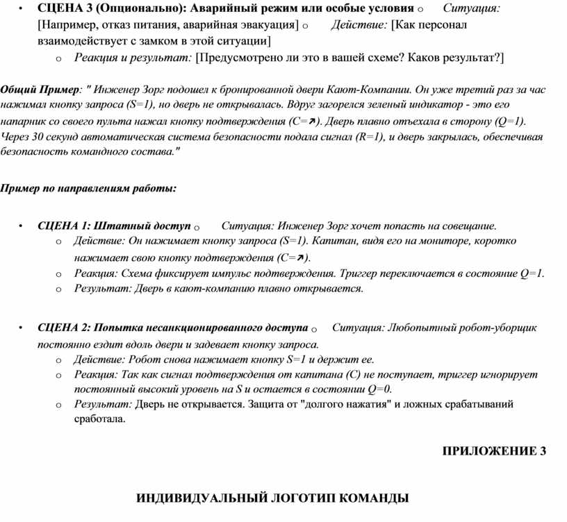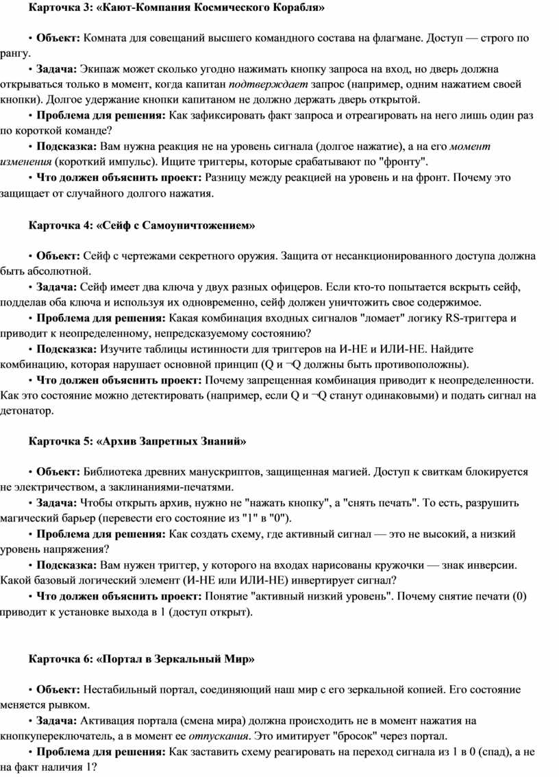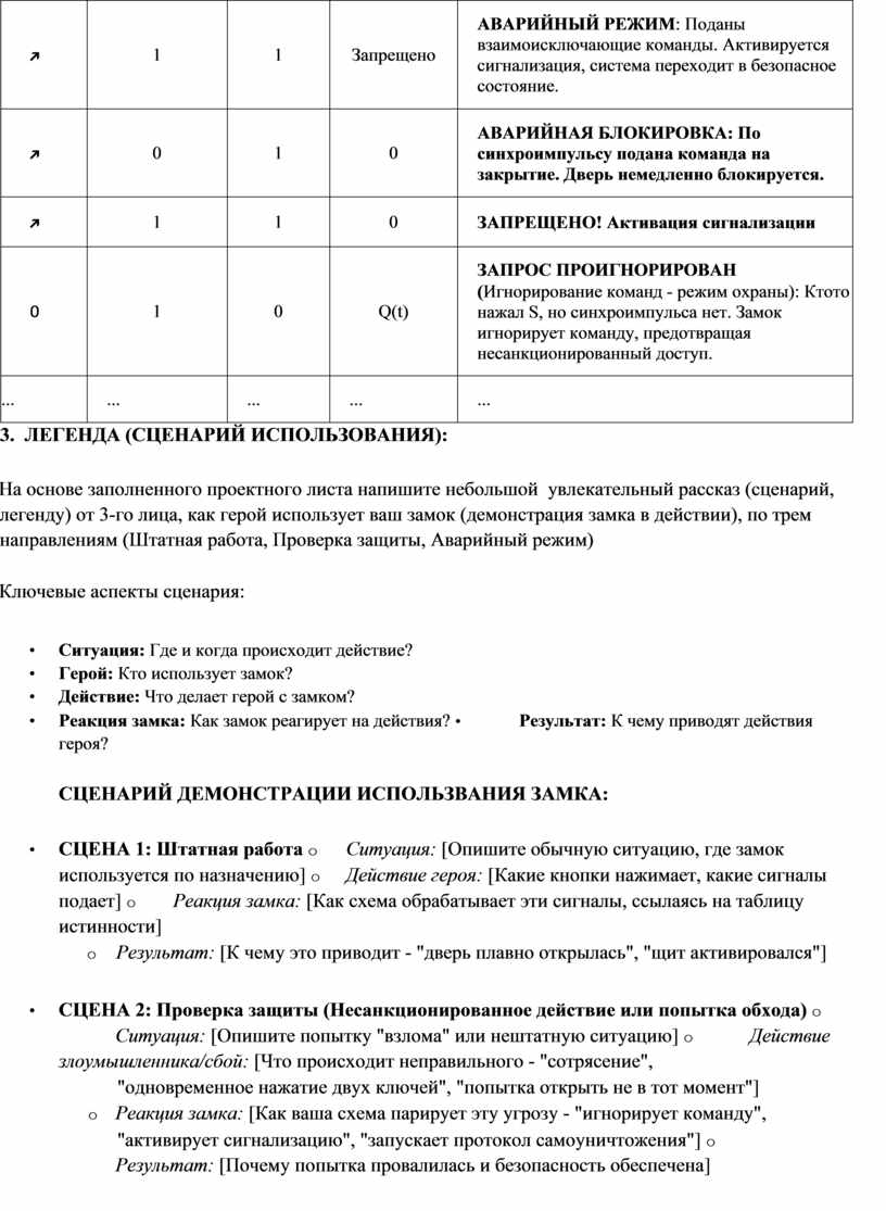 • СЦЕНА 1: Штатная работа o Ситуация: [Опишите обычную ситуацию, где замок используется по назначению] o Действие героя: [Какие кнопки нажимает, какие сигналы подает] o Реакция замка: [Как схема обрабатывает эти сигналы, ссылаясь на таблицу истинности]