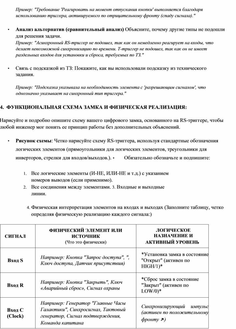 - Ключевые действия, которые должен выполнять замок (например, "открываться только в момент отпускания кнопки").