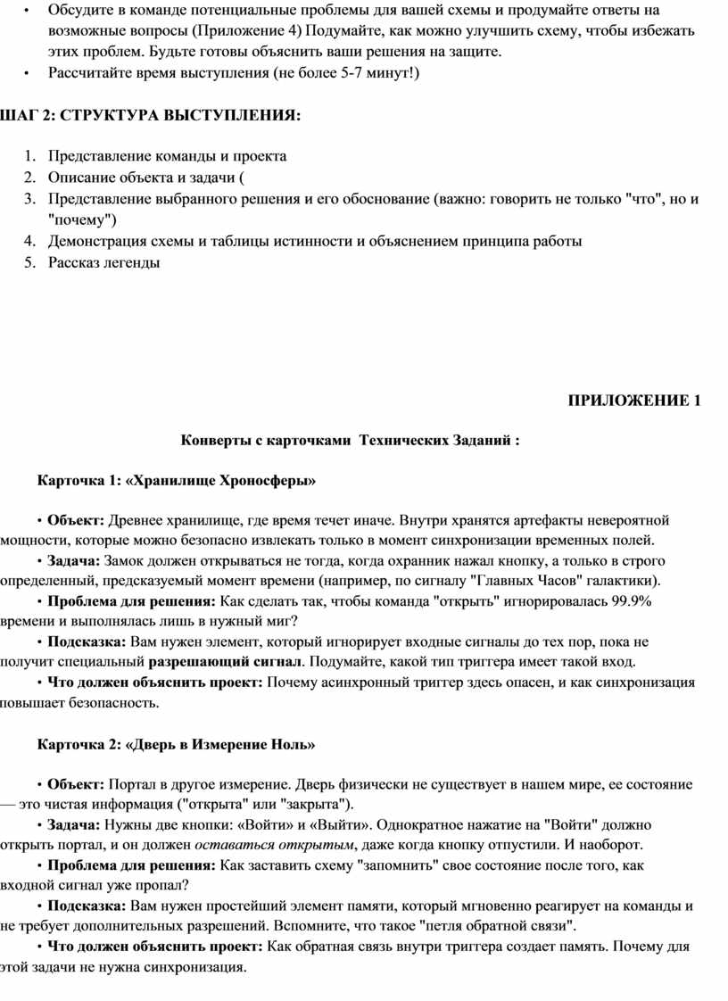• Обсудите в команде потенциальные проблемы для вашей схемы и продумайте ответы на возможные вопросы (Приложение 4) Подумайте, как можно улучшить схему, чтобы избежать этих проблем. Будьте готовы объяснить ваши решения на защите.