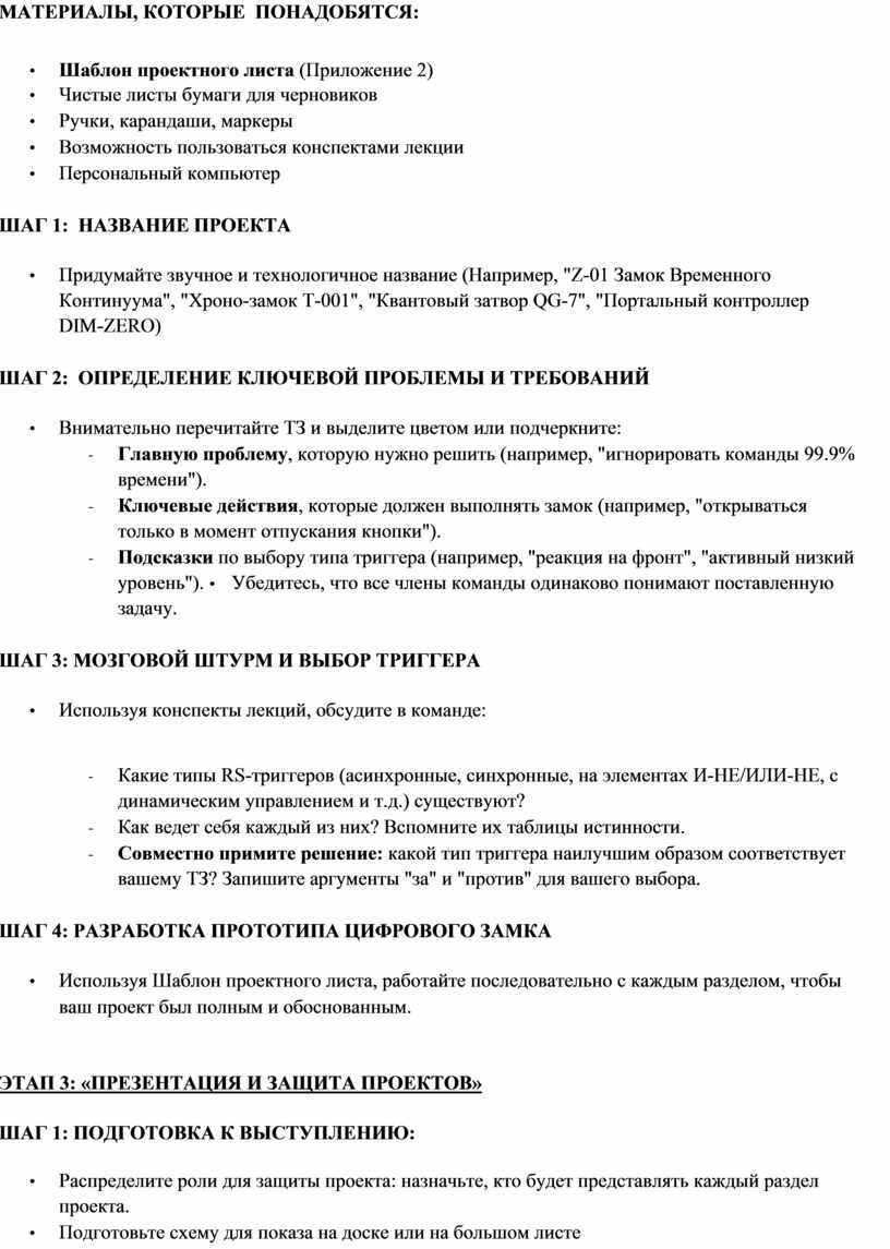 Цель — создать рабочий прототип цифрового замка, следуя выбранному Техническому Заданию.