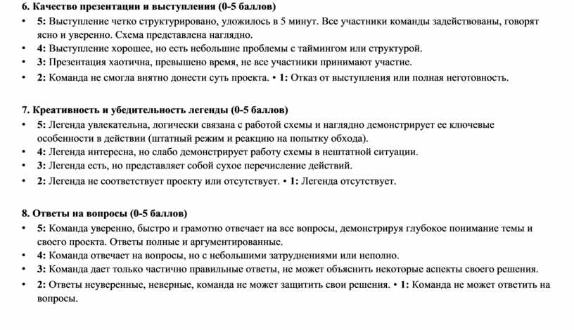 • 5: Команда уверенно, быстро и грамотно отвечает на все вопросы, демонстрируя глубокое понимание темы и своего проекта. Ответы полные и аргументированные.