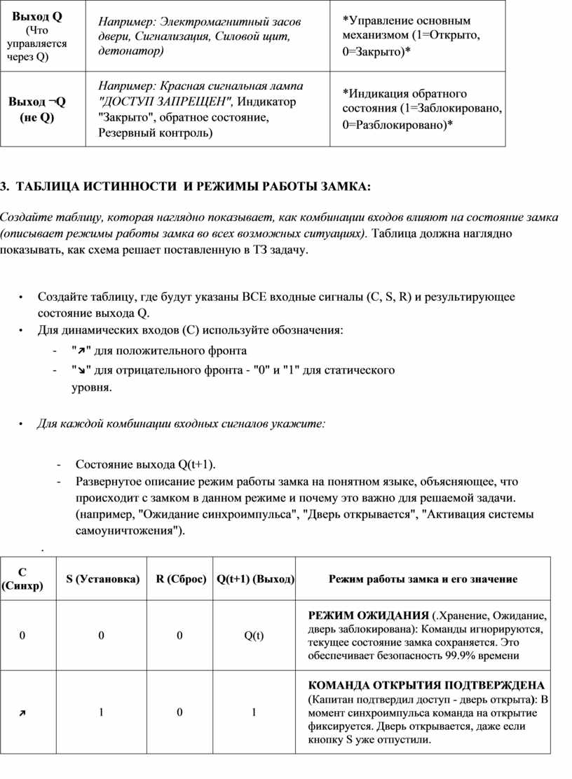 • Смоделировать работу схемы с помощью таблицы истинности, описывающей, как различные комбинации входных сигналов влияют на состояние замка.