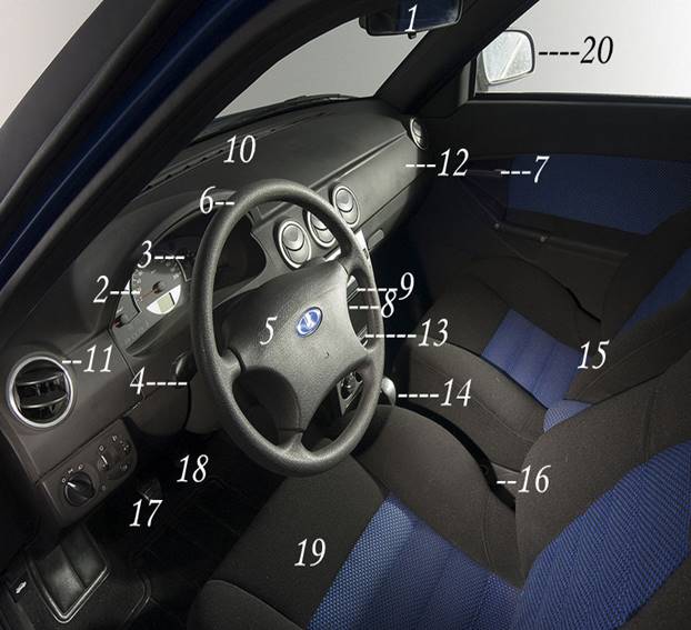 rearview mirror, speedometer, odometer, indicator, horn, ignition, headrest, gas pedal, break, CD player, air vent, dashboard, heater, seat belt, driver`s seat, passenger seat, gear stick, handbrake, accelerator, fuel gauge, fan, bonnet, carburetor, radiator, coil, header tank, dipstick, fan, windscreen wiper motor, air filter, battery, oil filter, fuel pump, starter motor, engine, fan belt, alternator