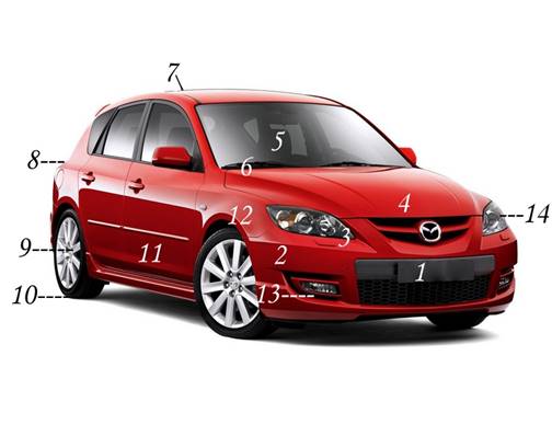 These words are: fog light, brake light, rear light, hood, headlight, sunroof, hubcap, tire, bumper, parking light, windscreen, windscreen wiper, trunk, door, number plate, wing, indicator, exhaust pipe, reflector, brake light, rear window, antenna, side mirror, mud flap, door handle, petrol cap, rear light