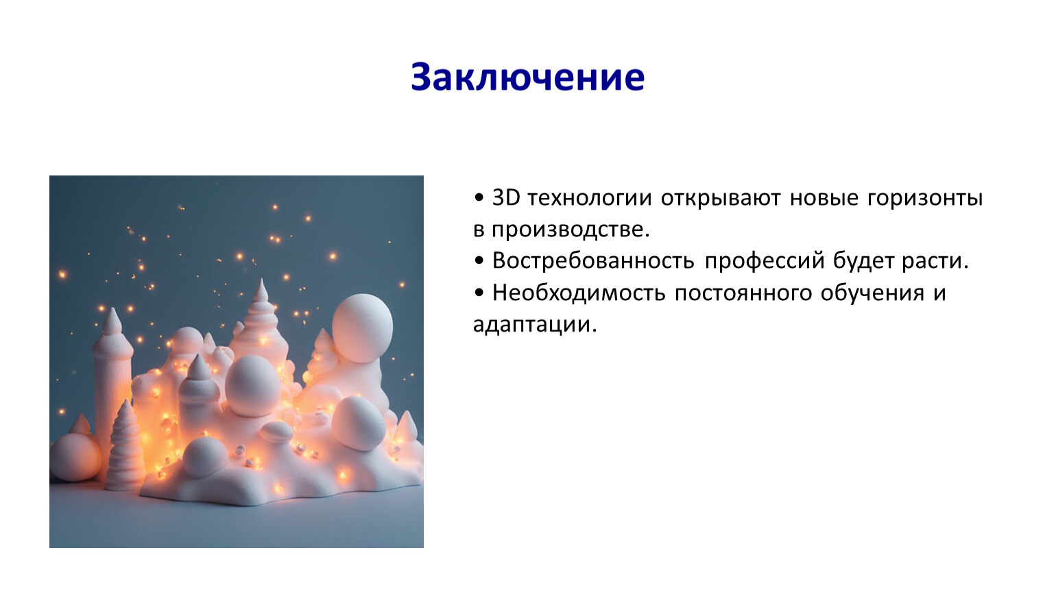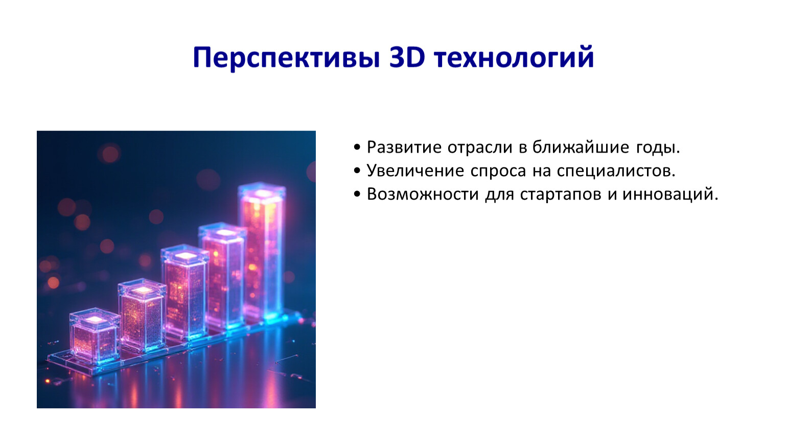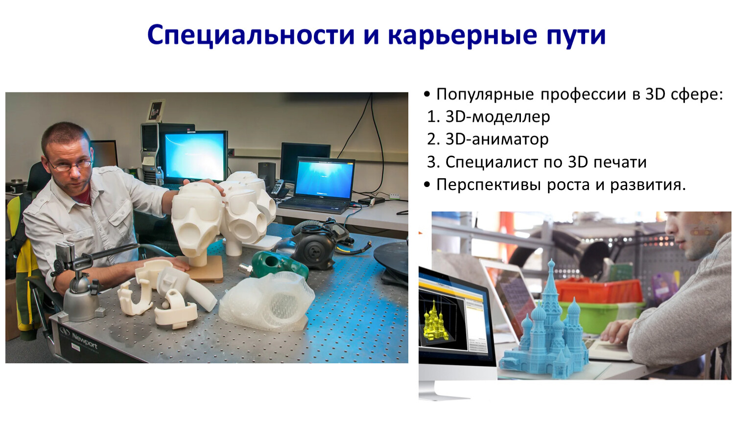 • Популярные профессии в 3D сфере: 1. 3D-моделлер 2. 3D-аниматор 3. Специалист по 3D печати • Перспективы роста и развития.