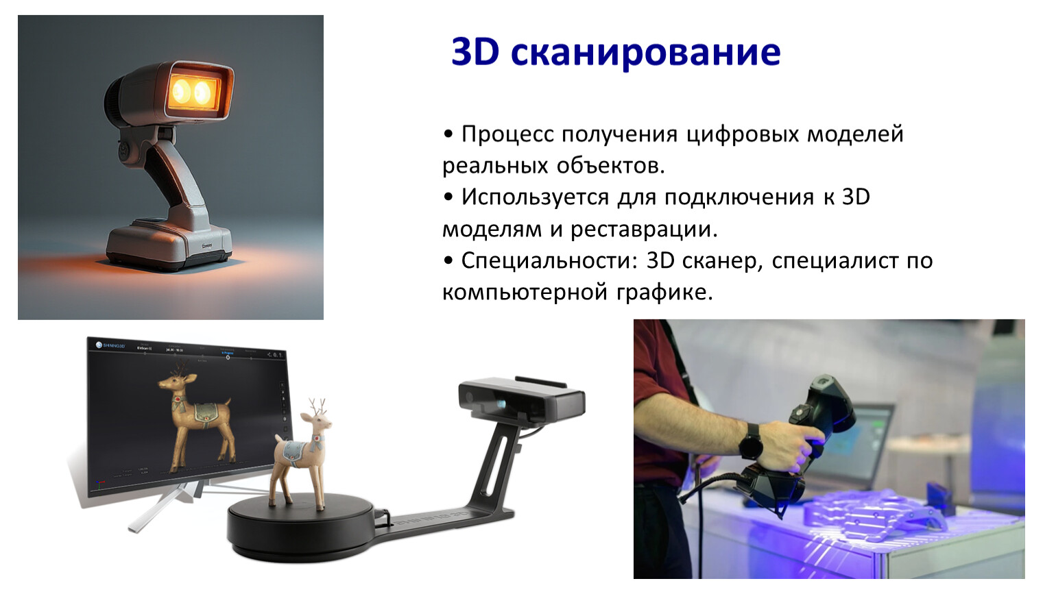 • Процесс получения цифровых моделей реальных объектов. • Используется для подключения к 3D моделям и реставрации. • Специальности: 3D сканер, специалист по компьютерной графике.