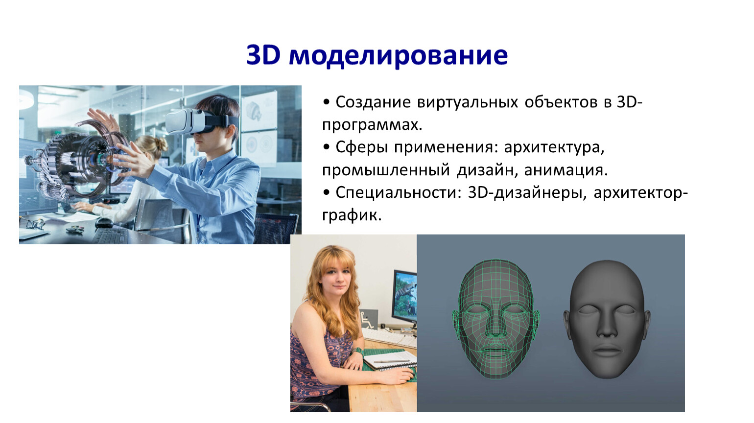 • Создание виртуальных объектов в 3D-программах. • Сферы применения: архитектура, промышленный дизайн, анимация. • Специальности: 3D-дизайнеры, архитектор-график.