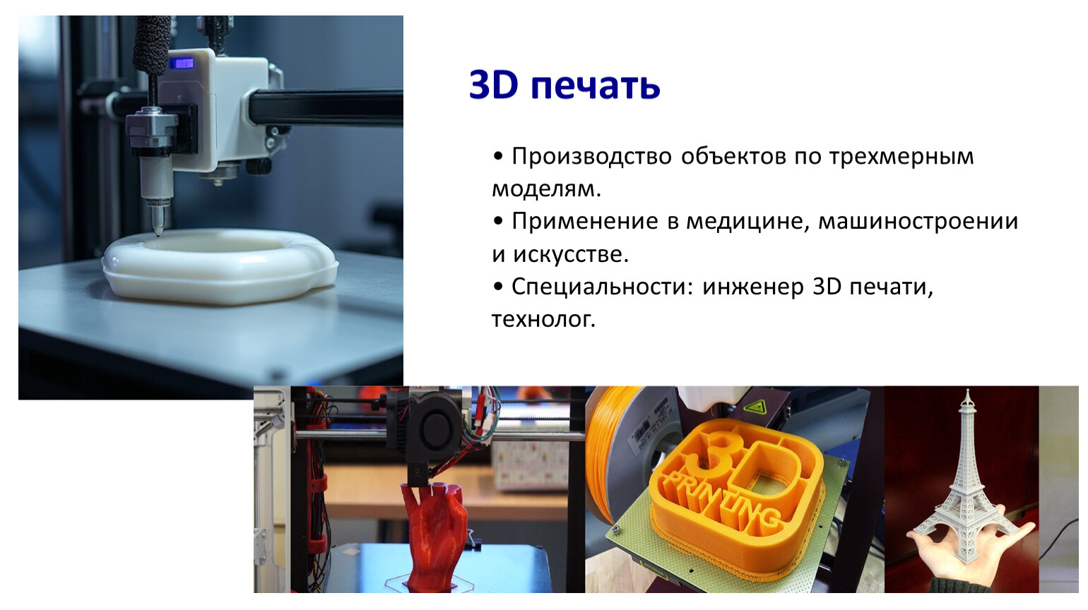 • Производство объектов по трехмерным моделям. • Применение в медицине, машиностроении и искусстве. • Специальности: инженер 3D печати, технолог.