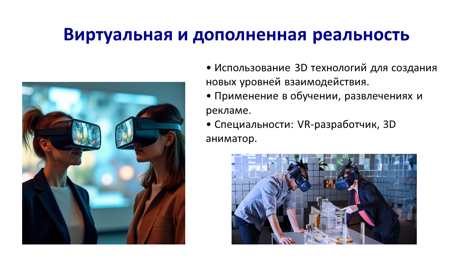 • Использование 3D технологий для создания новых уровней взаимодействия. • Применение в обучении, развлечениях и рекламе. • Специальности: VR-разработчик, 3D аниматор.