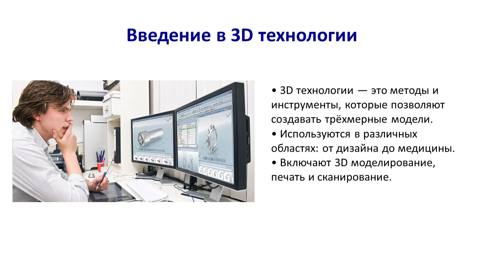 • 3D технологии — это методы и инструменты, которые позволяют создавать трёхмерные модели. • Используются в различных областях: от дизайна до медицины. • Включают 3D моделирование, печать и сканирование.