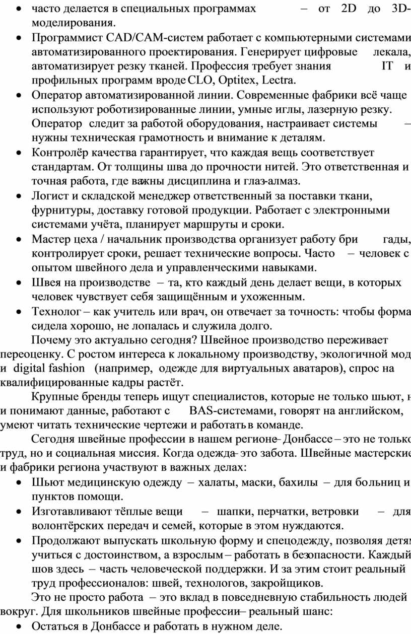 · Провожу профориентационную работу – рассказываю, что после 9 или 11 класса можно поступить в техникум, например, Донецкий промышленно-экономический колледж, где есть направления по технологии швейного производства.