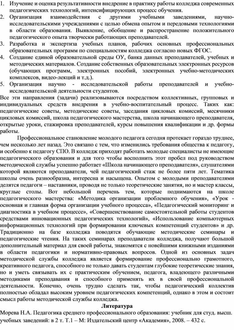1. Морева Н.А. Педагогика среднего профессионального образования: учебник для студ. высш. учебных заведений: в 2 т. Т.1 – М: Издательский центр «Академия», 2008. – 432 с.