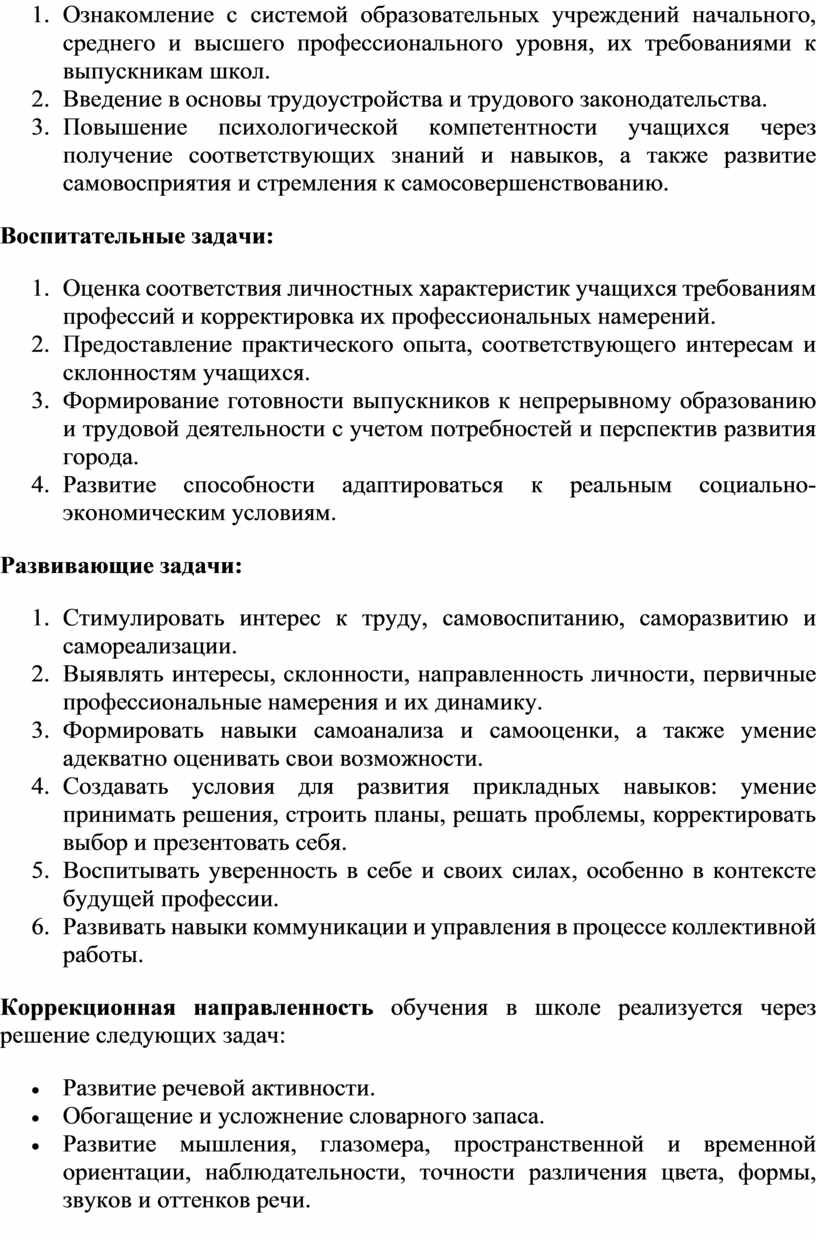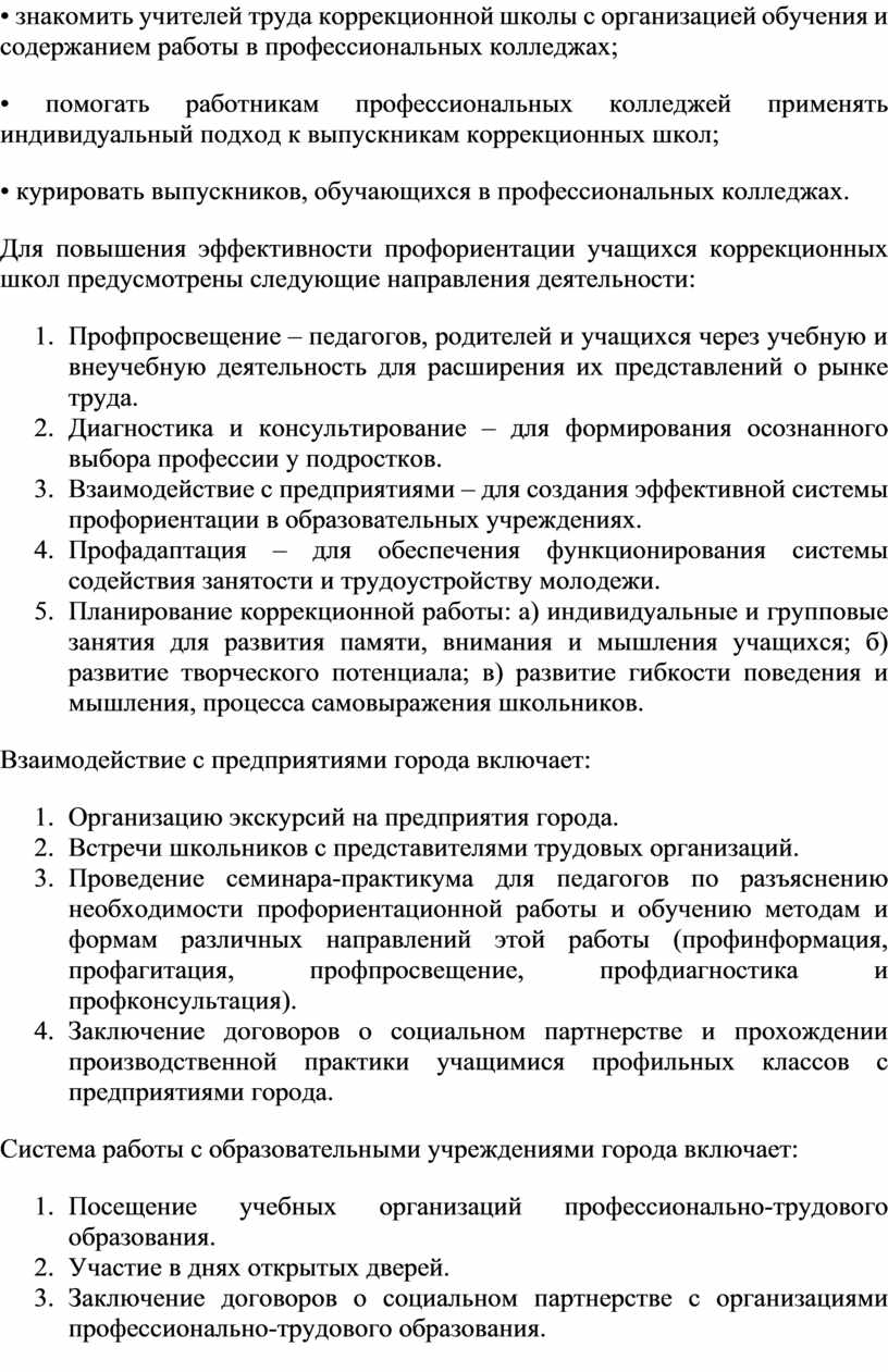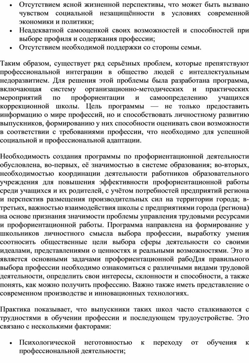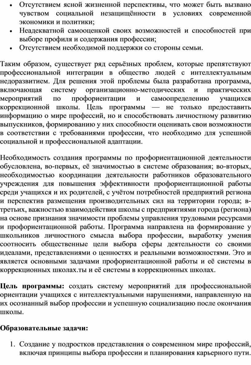 Необходимость создания программы по профориентационной деятельности обусловлена, во-первых, её значимостью в системе образования; во-вторых, необходимостью координации деятельности работников образовательного учреждения для повышения эффективности профориентационной работы среди учащихся и их родителей, с учётом потребностей предприятий региона и перспектив размещения производительных сил на территории города; в-третьих, важностью взаимодействия школы с предприятиями города (региона) на основе признания значимости проблемы управления трудовыми ресурсами и профориентационной работы. Программа направлена на формирование у школьников личностного смысла выбора профессии, выработку умения соотносить общественные цели выбора сферы деятельности со своими идеалами, представлениями о ценностях и реальными возможностями. Это и является основными задачами профориентационной работы и её системы в коррекционных школах.ты и её системы в коррекционных школах.